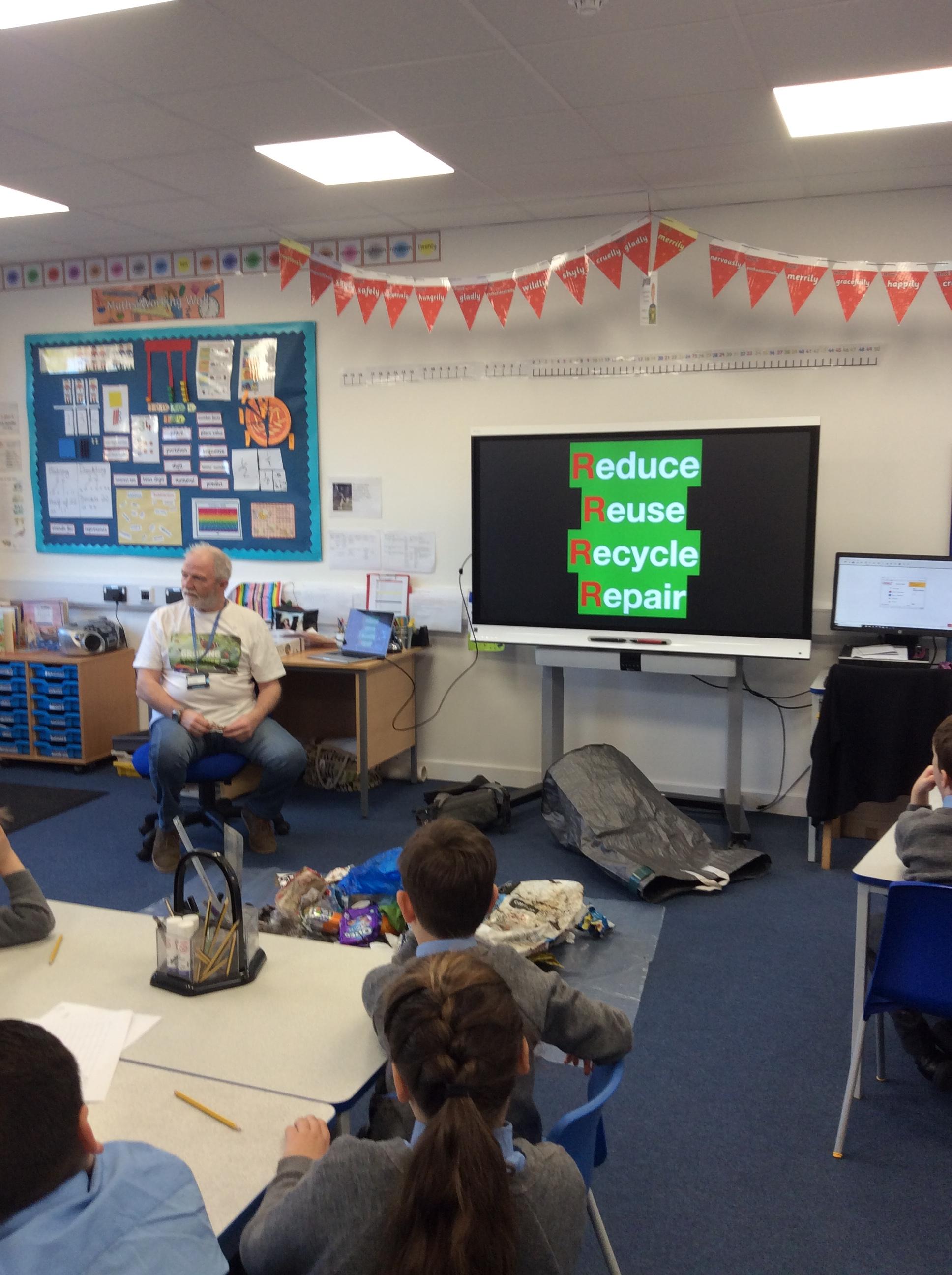 The children have had a great session today with George McGavin on reducing, reusing and recycling and the importance of looking after the environment. George began the session by showing the children all the rubbish that he had collected on a litter pick from the top of Watersplash Lane to Cheapside School, a distance of just 500 metres!! They were rather shocked and surprised at the results of 3.5kg of litter !... but it began making them think! George then talked to the children about how much litter we then might find alongside the road networks across the UK. This led into talking about the problems with plastics, palm oil and where we dispose of our litter. The children have been tasked with a recycling challenge this month. Please click on the links below to find out about the challenge.