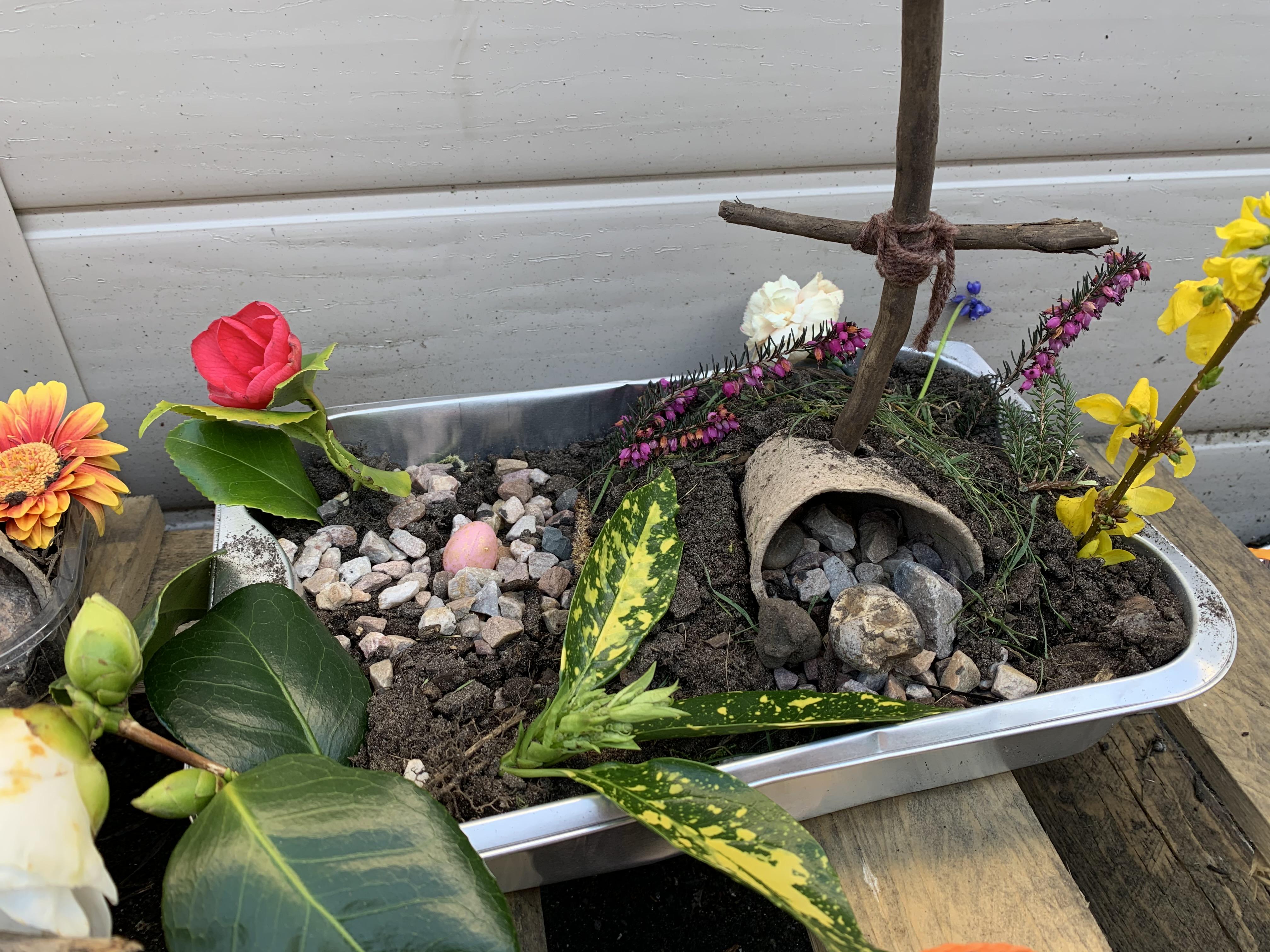 Children in Reception to Year 4 have enjoyed making Easter Gardens in Forest School this week. The children have included symbols of Easter - a cross, a tomb and flowers in their gardens and have talked about these symbols and their association with Easter and the Easter story. They have also enjoyed hot cross buns toasted on the camp fire. I am sure you will agree that the gardens the children made looked beautiful ! Well done everyone !