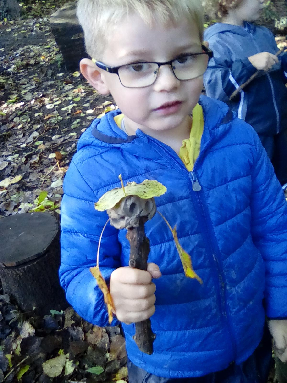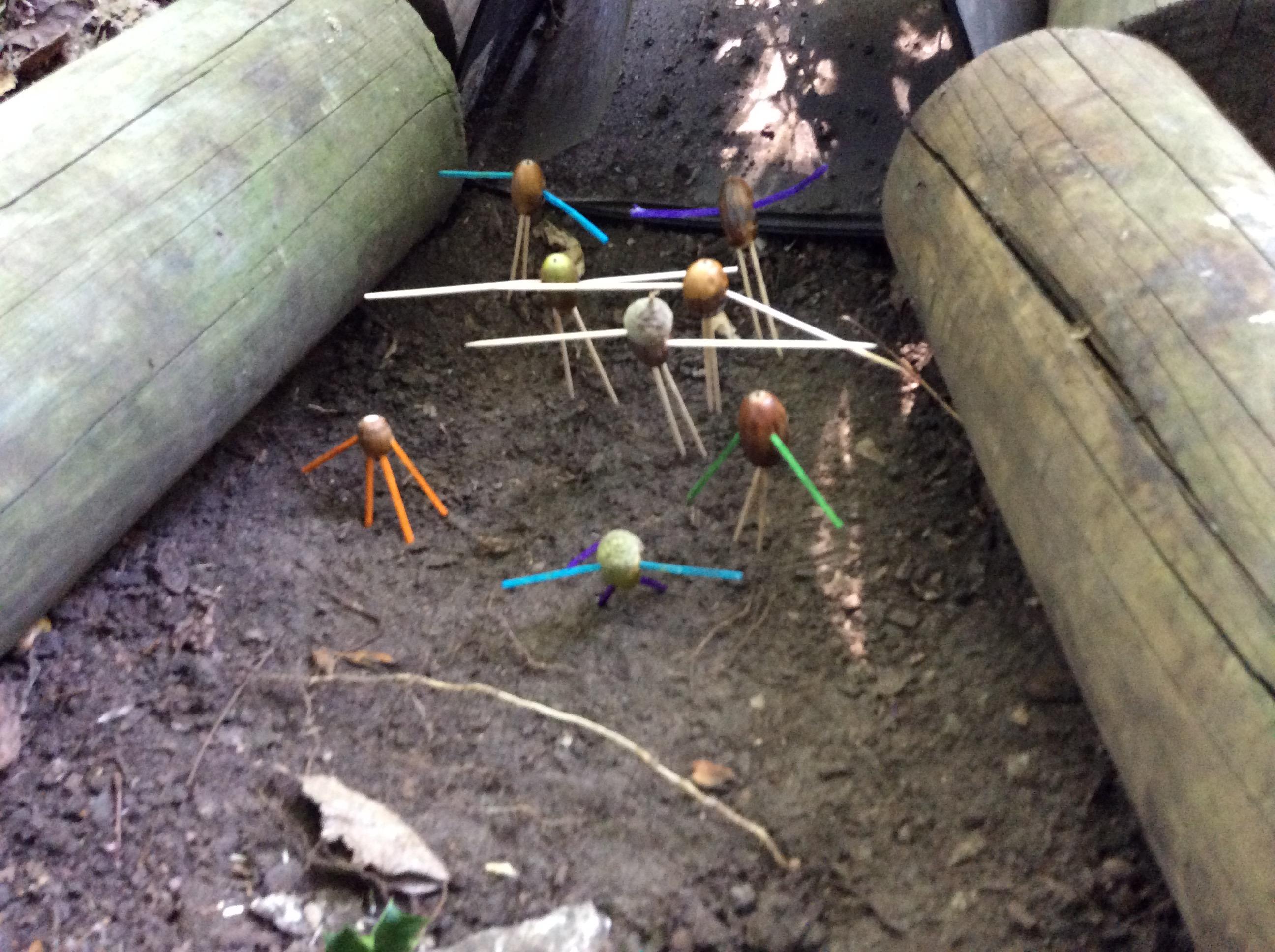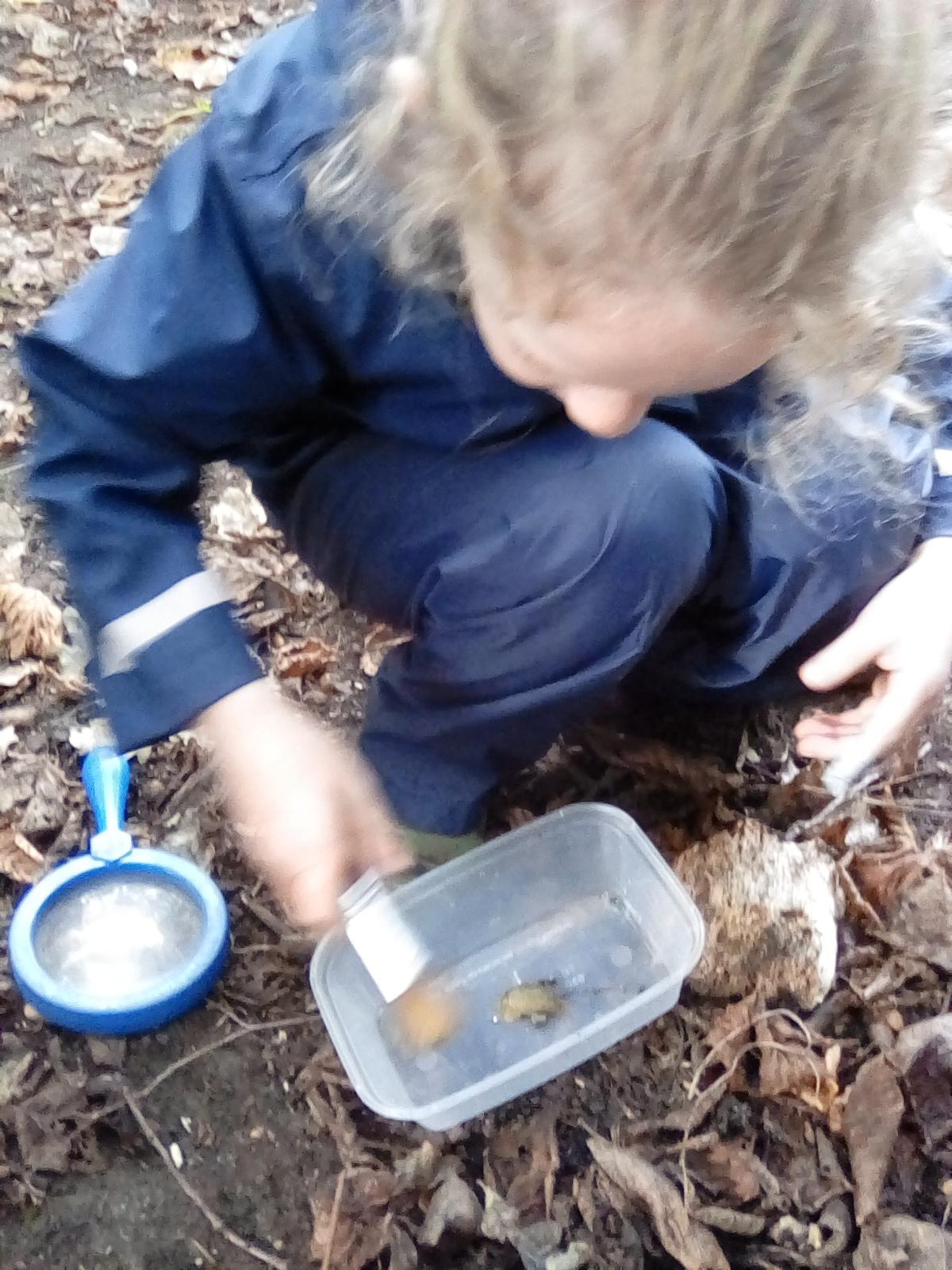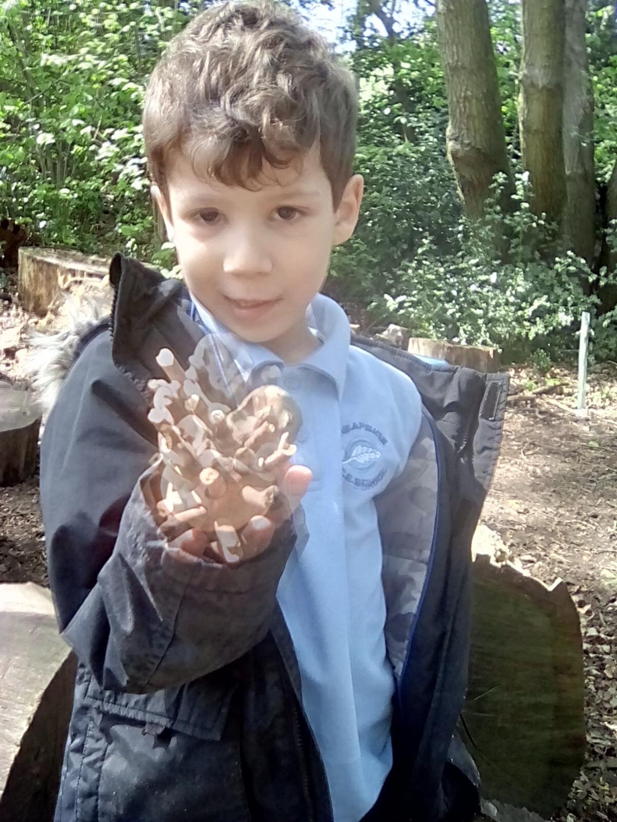 Today was Roald Dahl day in school, so to celebrate we had a Roald Dahl themed session. Kestrels and Kingfishers read an extract of Billy and the Minpins and then got their creative juices following by creating The Gruncher from the book and some Minpins. The children had to work in groups where the focus was on listening and responding appropriately to others. They were also using spoken language to develop understanding through imagining and exploring ideas. During the session we talked about team work, negotiating and compromise. The children produced some creative pieces and of course enjoyed the campfire and marshmallows. Below is a selection of some of the Grunchers and Minpins! Some of the children got very excited by the discovery of some larva under a log. We spent ages considering what he could be, some children even took the photo home for some further research. We decided it was Stag Beetle Larva but see what you think !