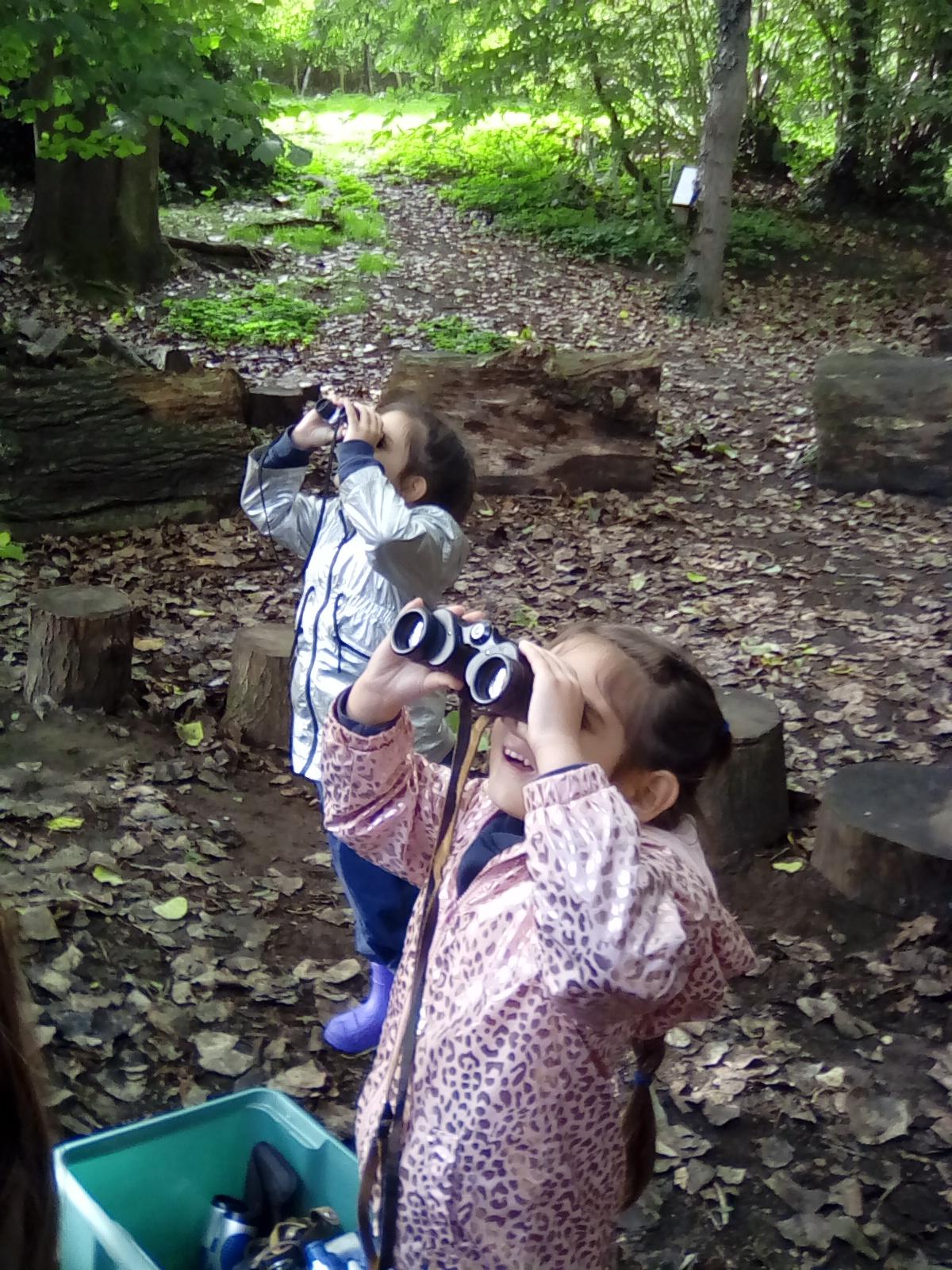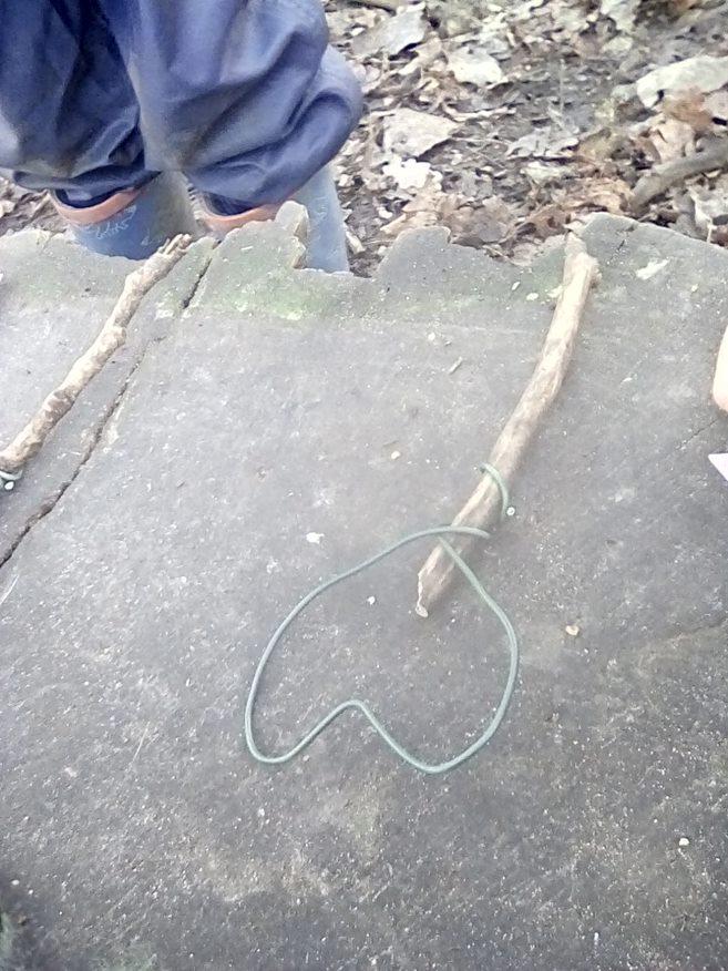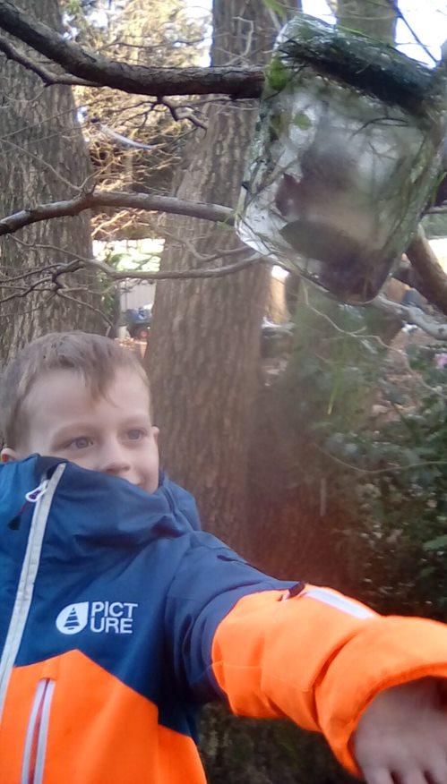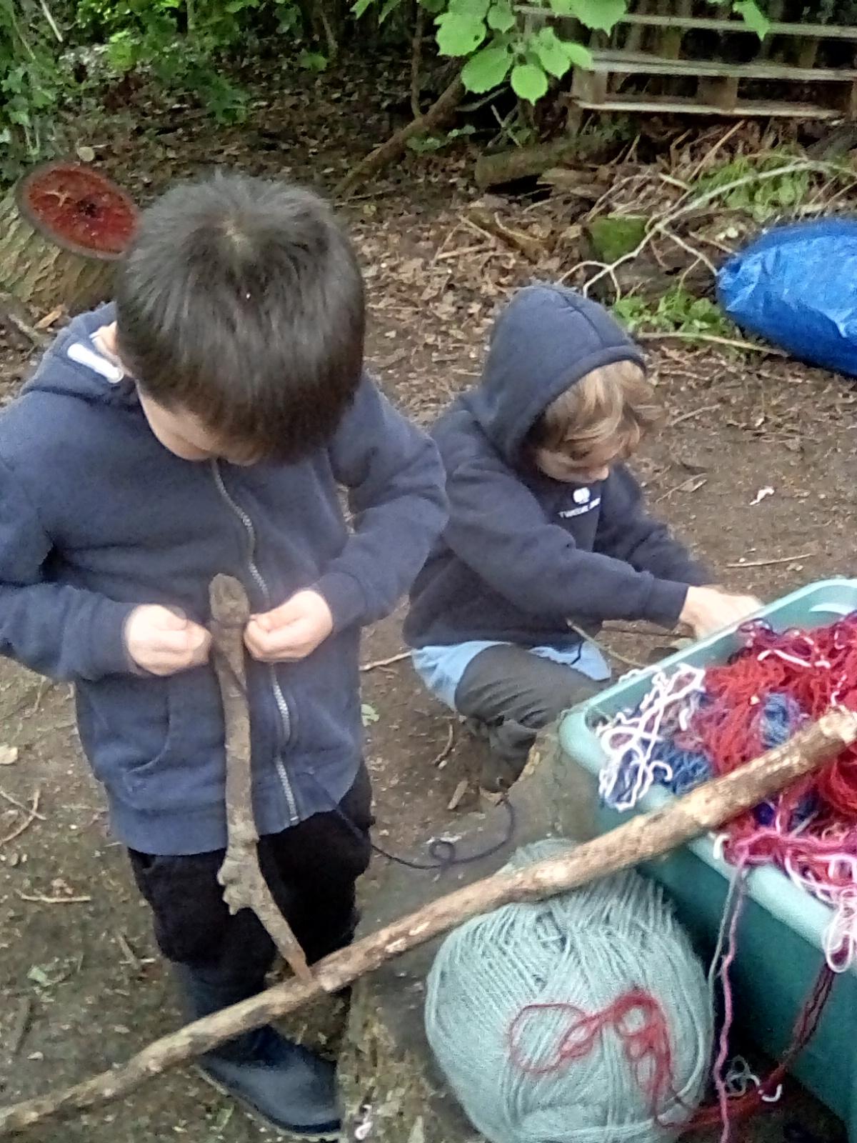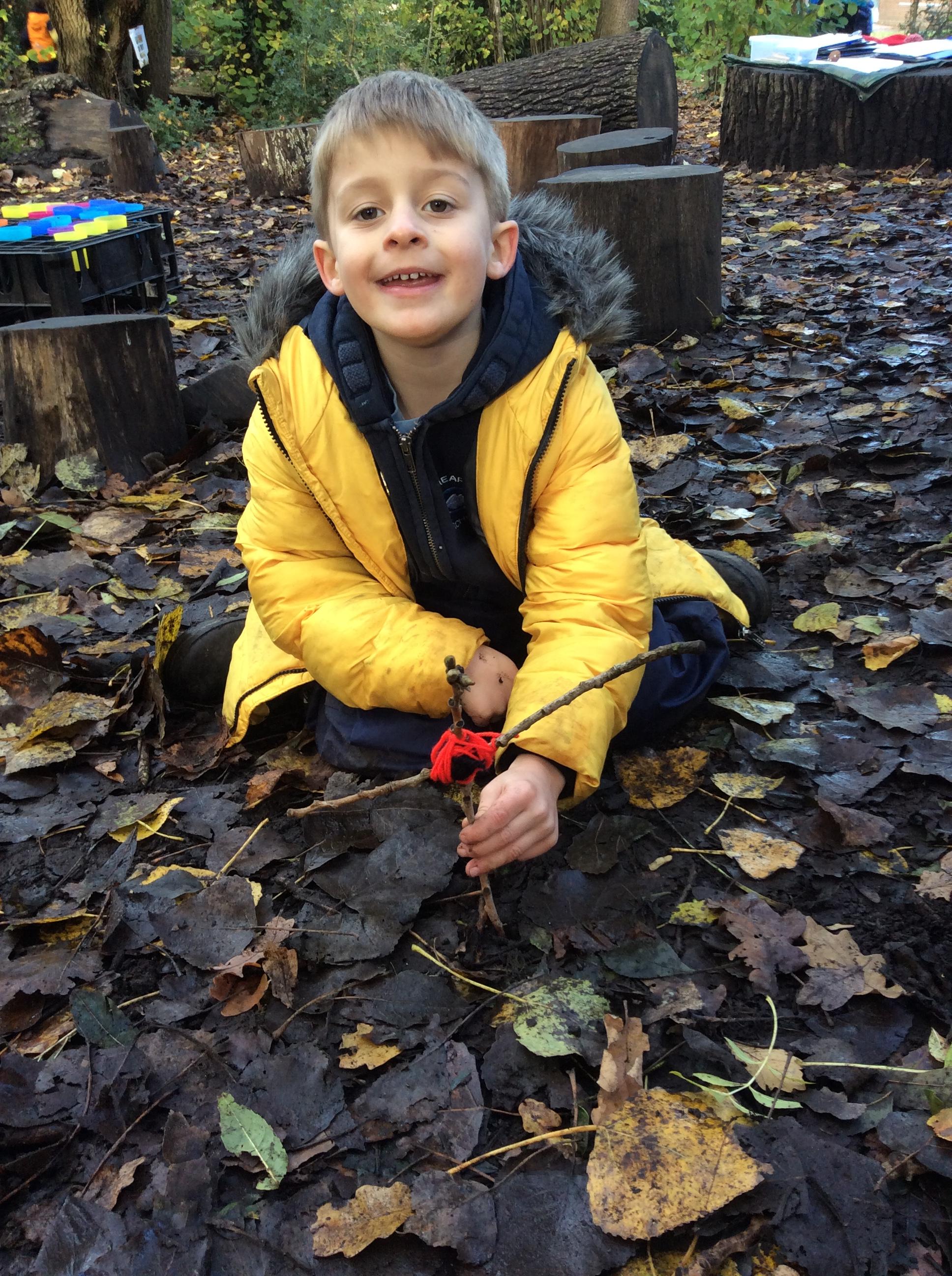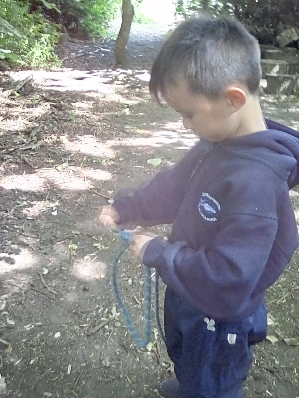 Wrens Class had a brilliant first session in the forest today. I was really impressed with all the Wrens and how well they manged for a whole day outside!! Once we had got the boots and waterproofs on we headed into the forest only to discover that the dinosaurs had escaped from their bucket and were hiding somewhere in the forest ! We got into dinosaur detective mode and armed with binoculars and magnifying glasses went off in search of the missing dinosaurs. Many of the children also discovered different animals and insects as well and were delighted to do so. In the session after lunch we split into 2 groups where we did some simple games on the field and then used the forest to collect some special treasures to make a treasure stick to take home. All the children had a go at using a knot to attach string to a stick. Well done Wrens for your enthusiasm, engagement and perseverance !