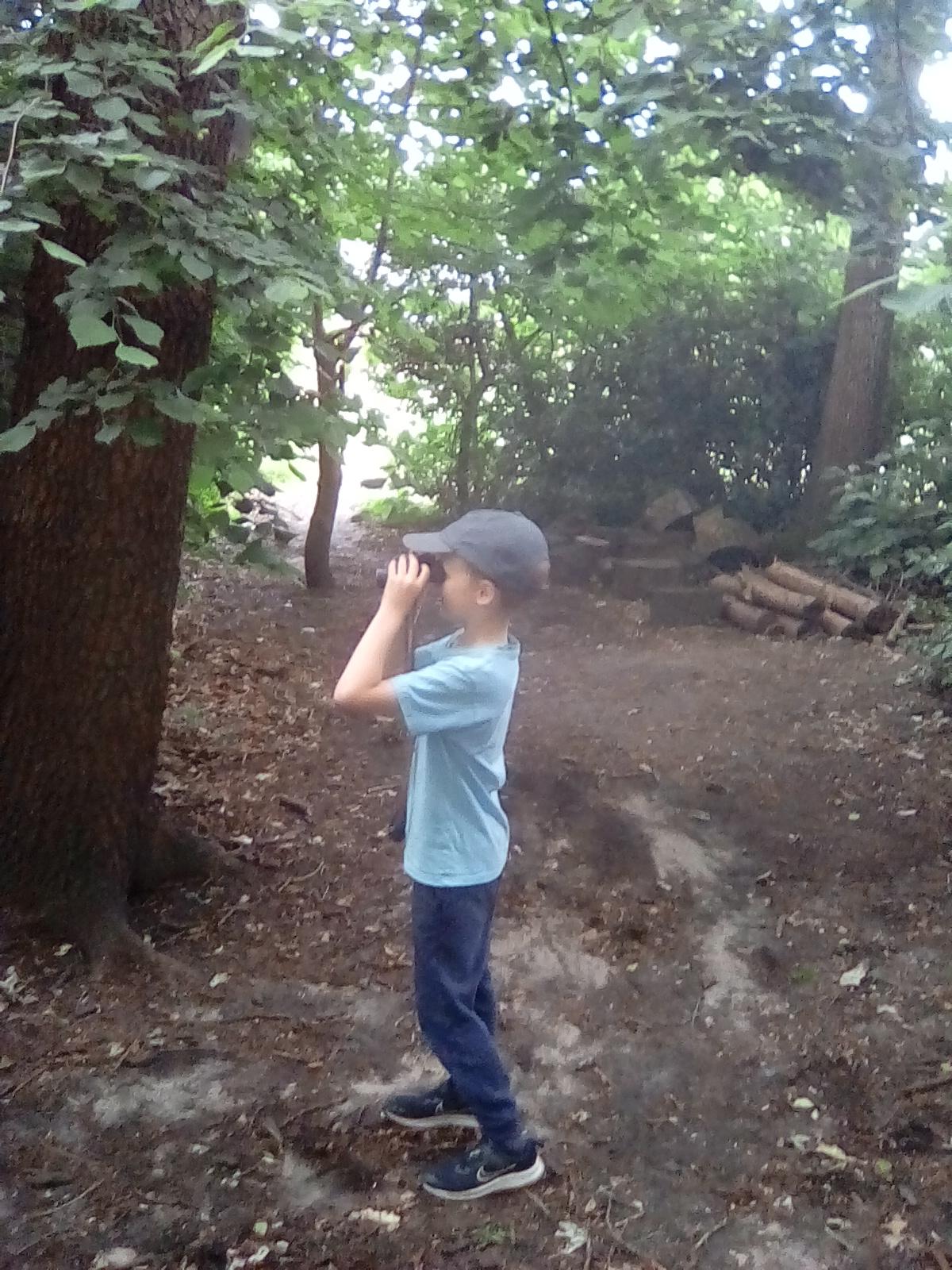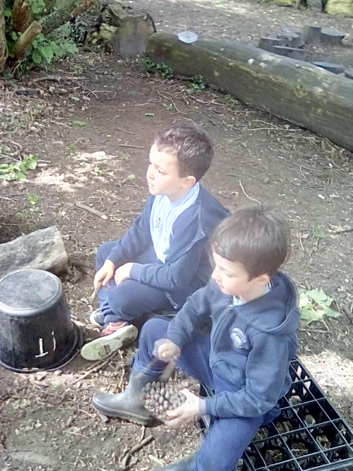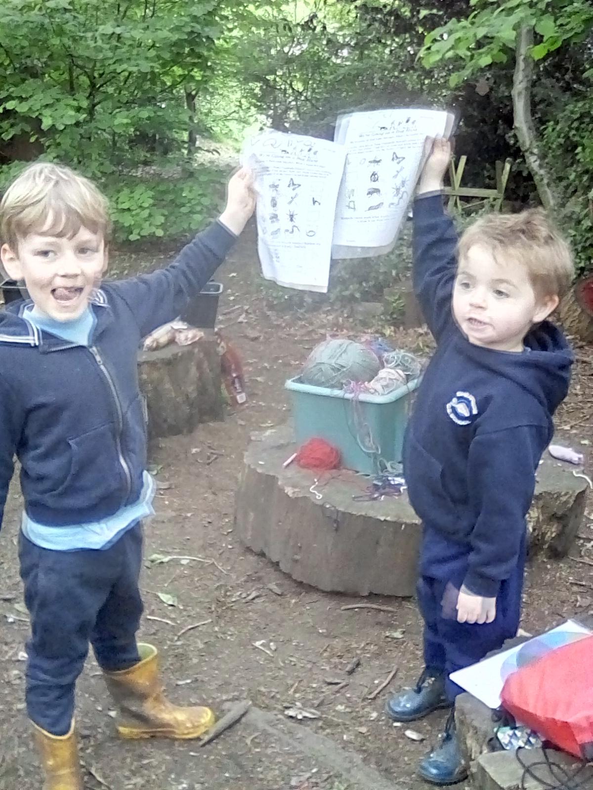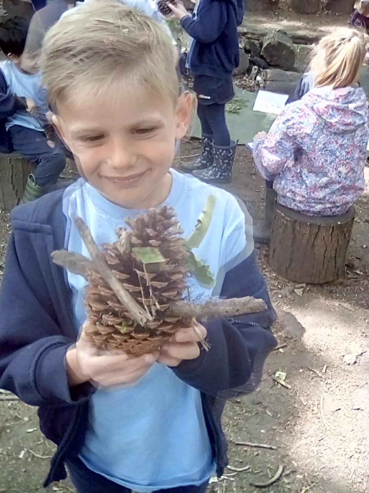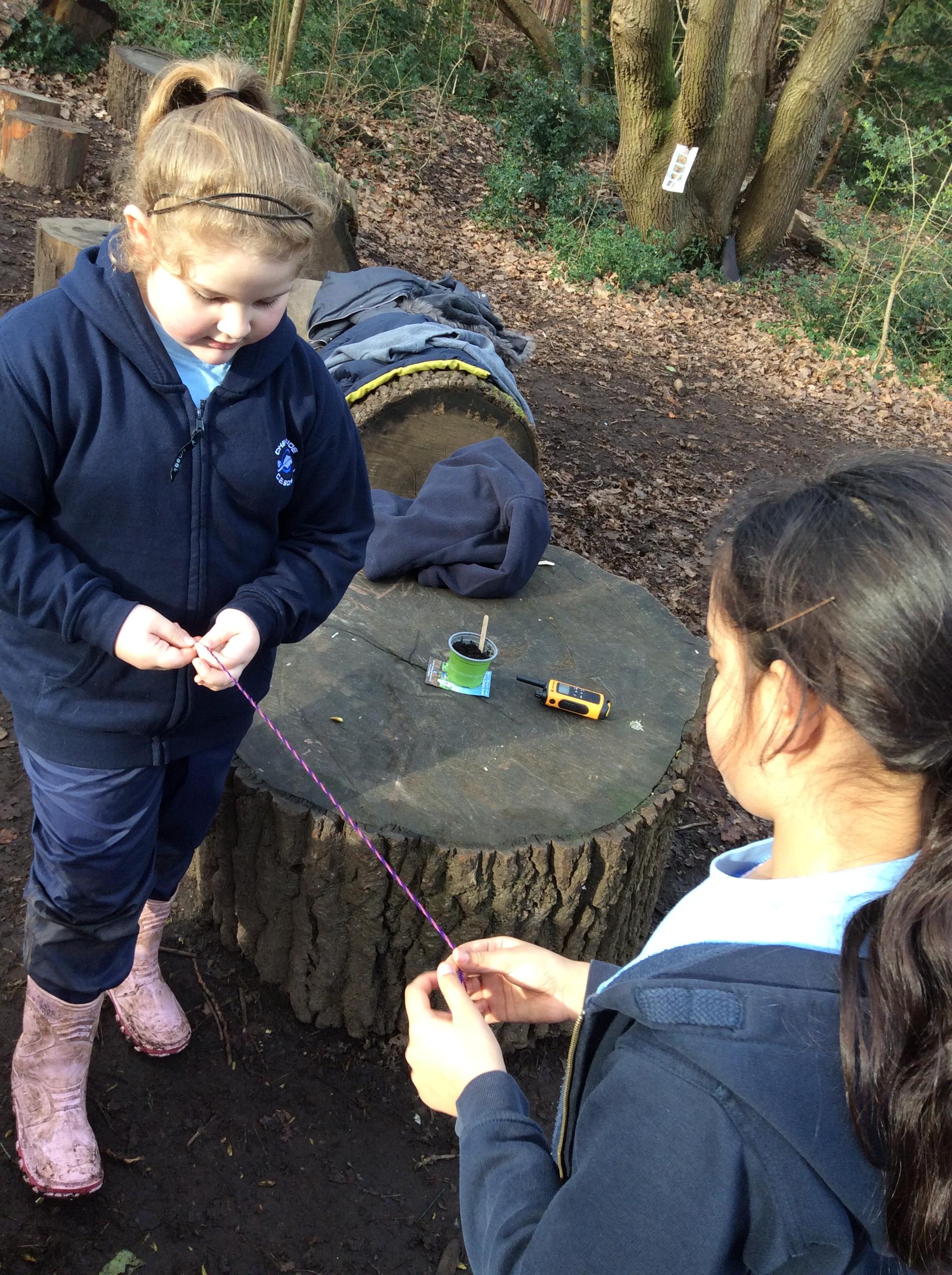 Wrens Class had a brilliant first session in the forest today. I was really impressed with all the Wrens and how well they manged for a whole day outside!! Once we had got the boots and waterproofs on we headed into the forest only to discover that the dinosaurs had escaped from their bucket and were hiding somewhere in the forest ! We got into dinosaur detective mode and armed with binoculars and magnifying glasses went off in search of the missing dinosaurs. Many of the children also discovered different animals and insects as well and were delighted to do so. In the session after lunch we split into 2 groups where we did some simple games on the field and then used the forest to collect some special treasures to make a treasure stick to take home. All the children had a go at using a knot to attach string to a stick. Well done Wrens for your enthusiasm, engagement and perseverance !