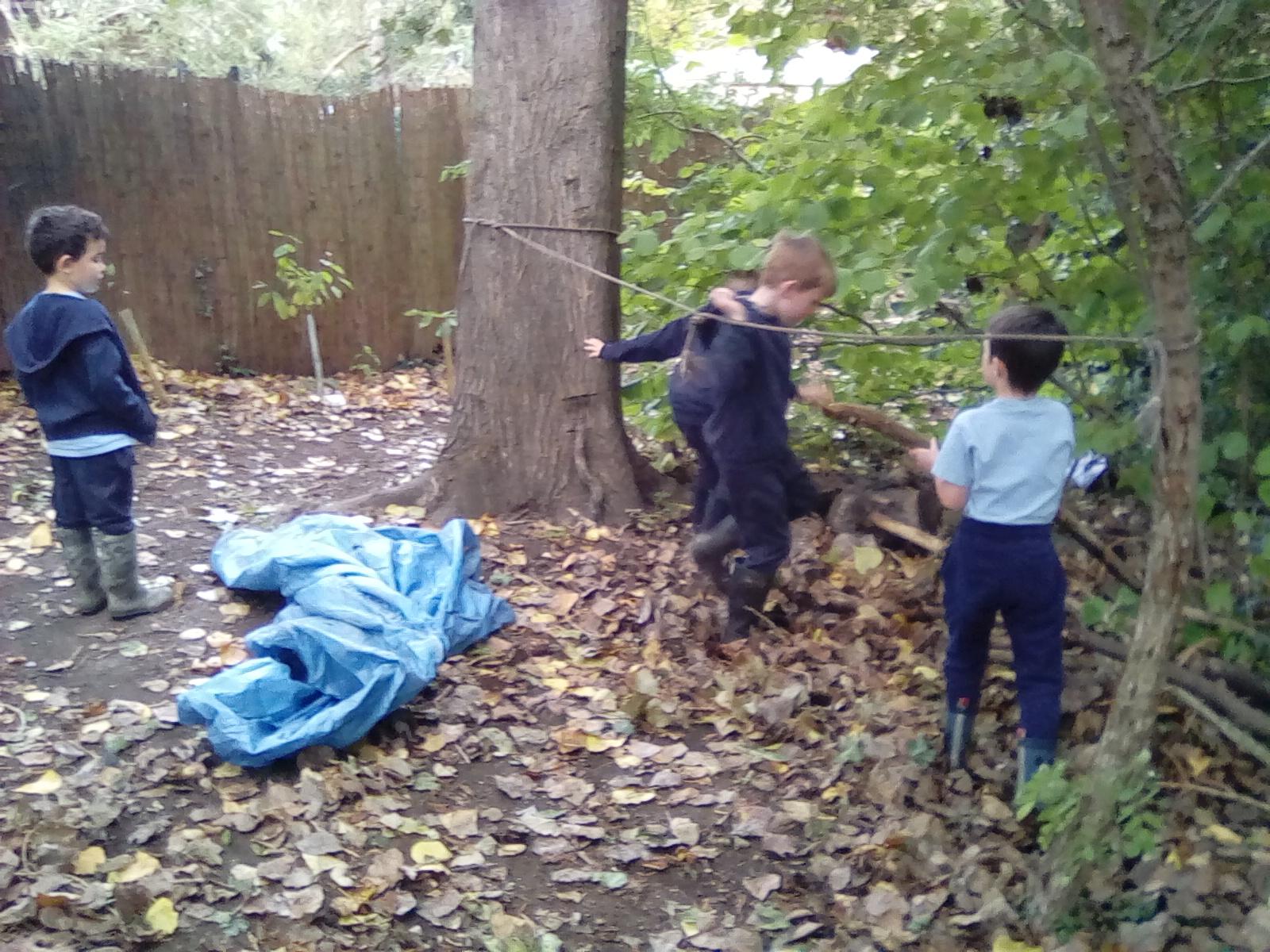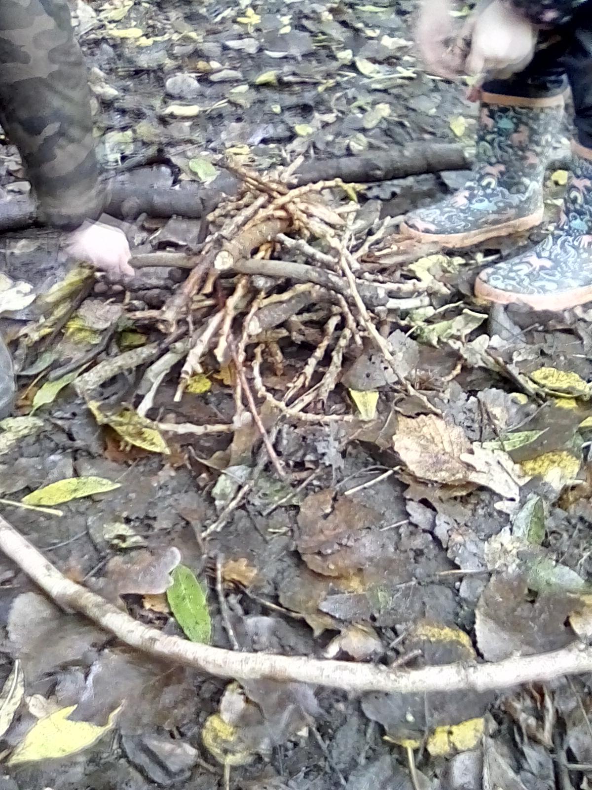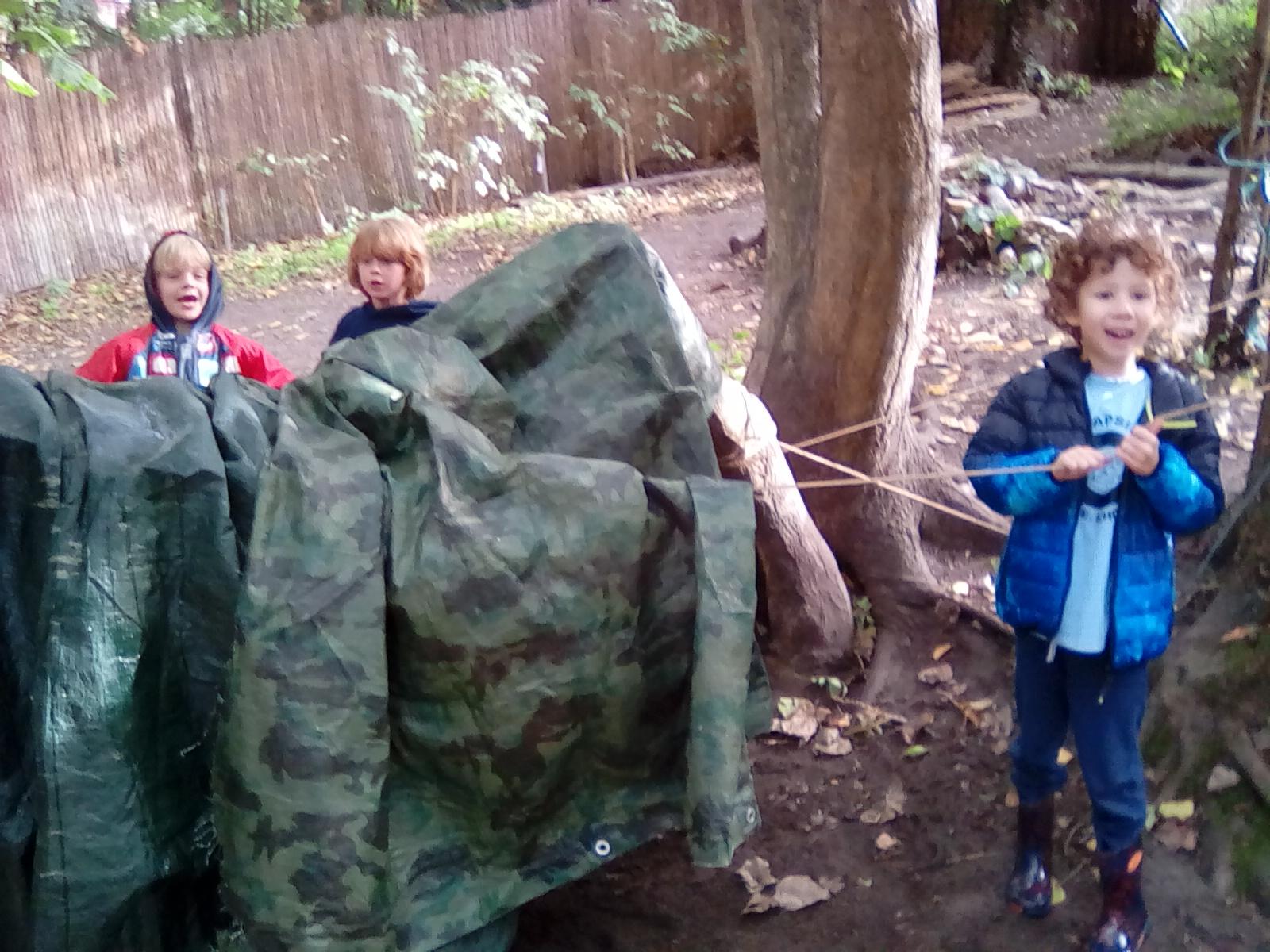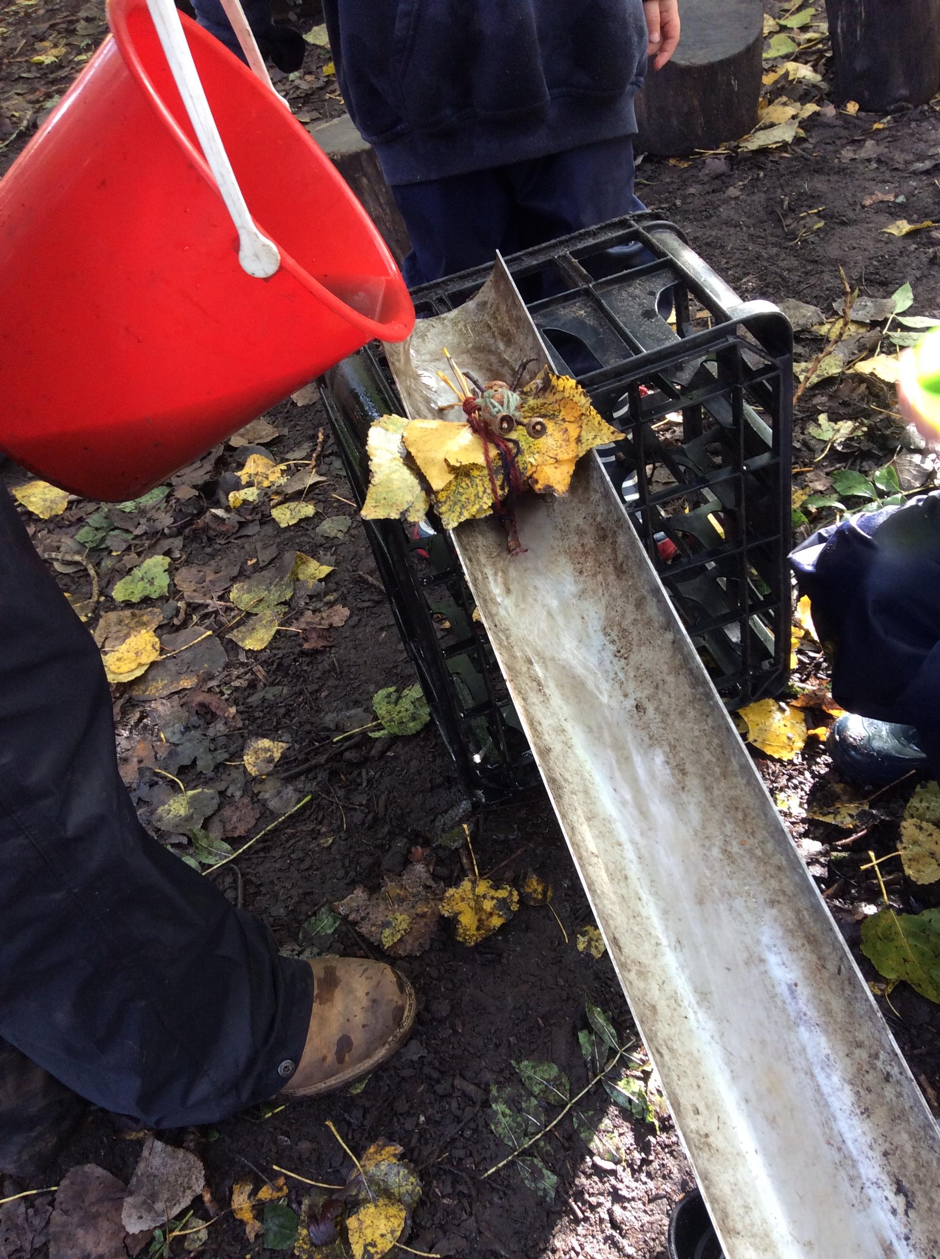 A very wet session today, but the Wrens were very keen to collect all the water from around the Forest! They also took advantage of the shelters and guttering. Even creating leaf art on the tarpaulin! Unfortunately, the wind was too gusty in the afternoon for year 1, but they became animal footprint experts!