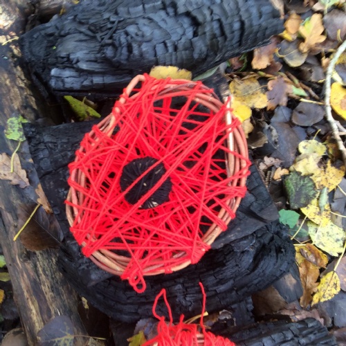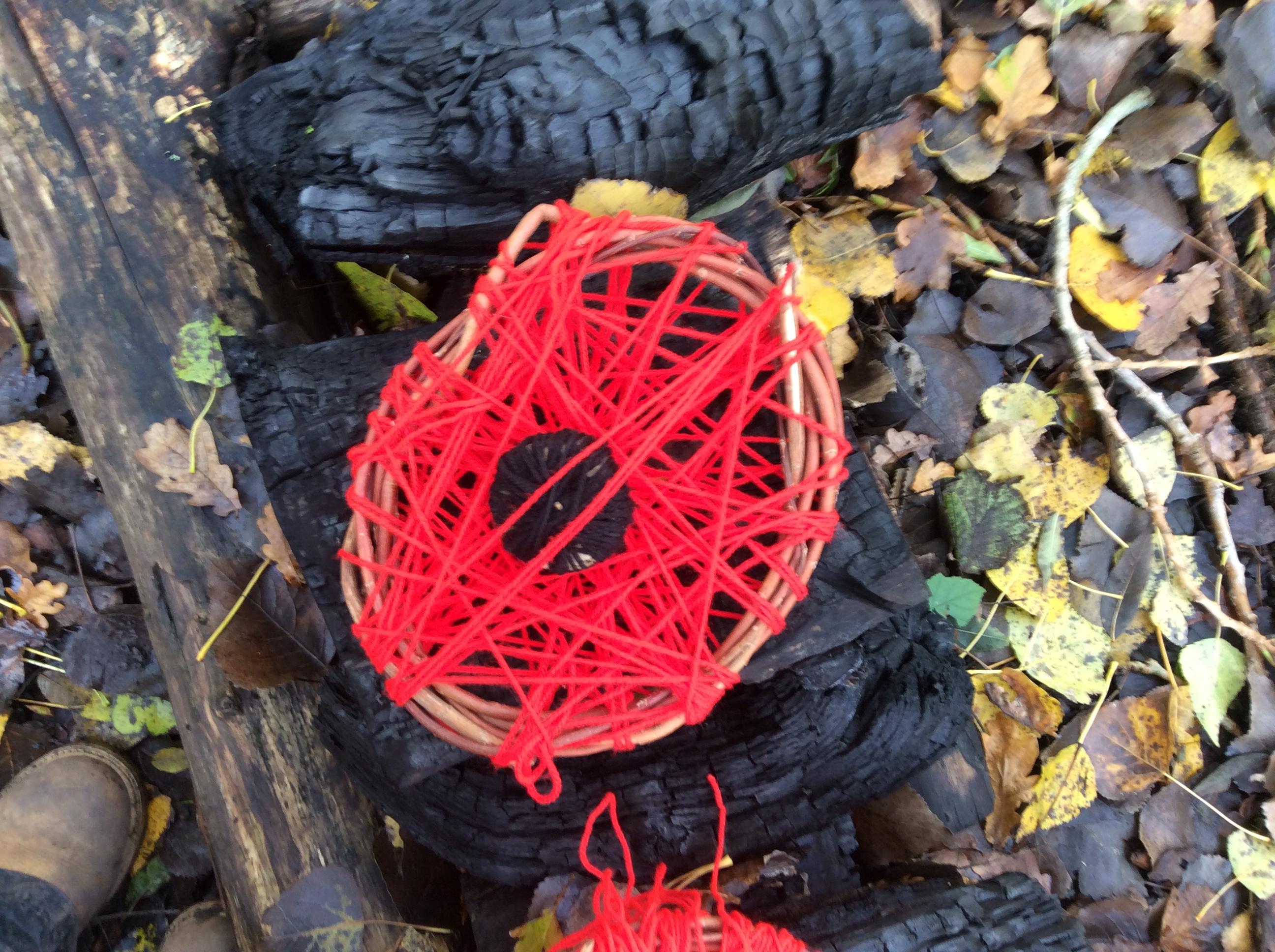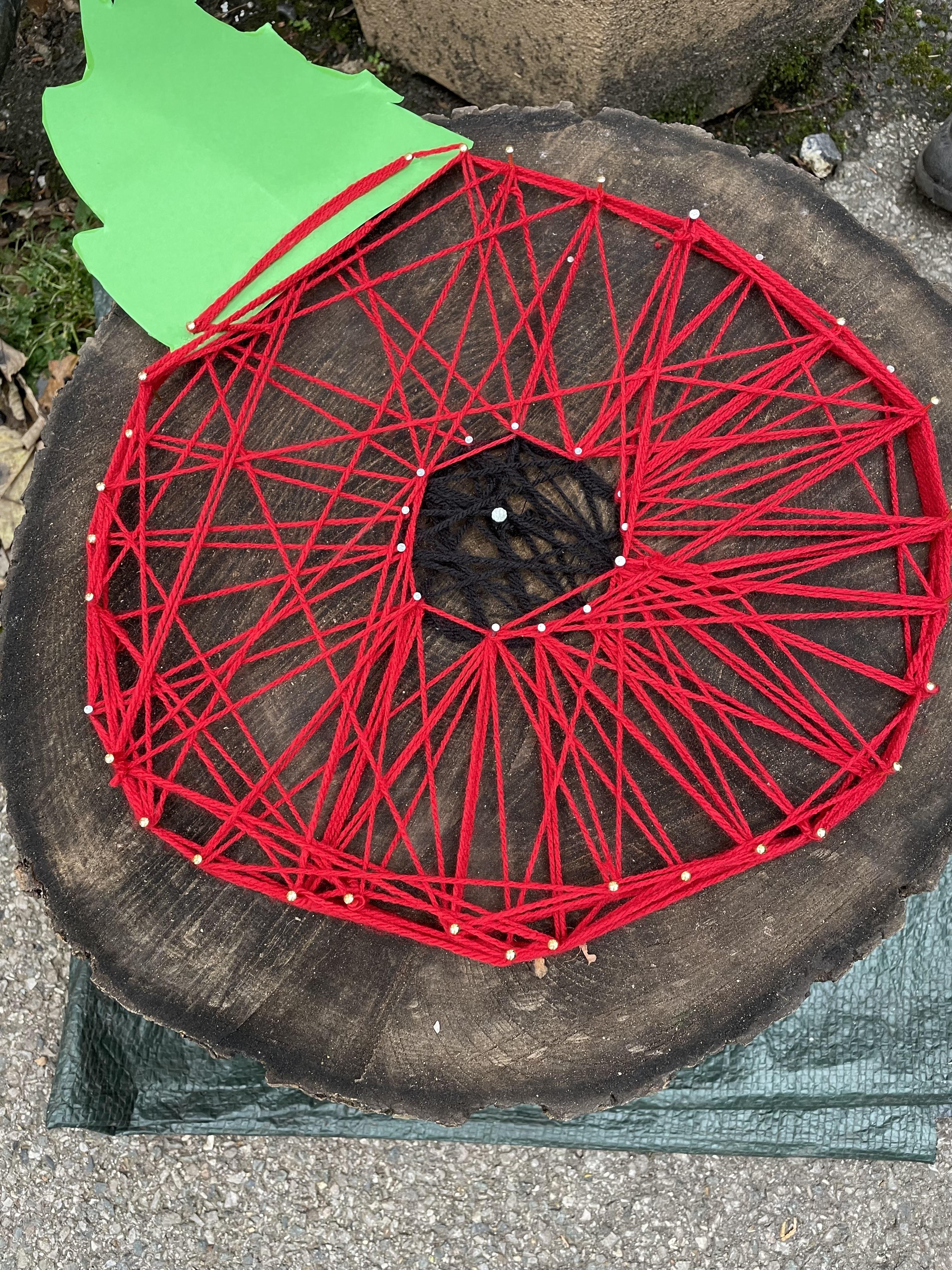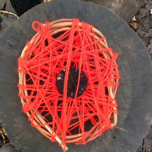 Nails were hammered into a stump and then wool was wrapped around them to create another group poppy (started by year 2 and completed by groups of older children).