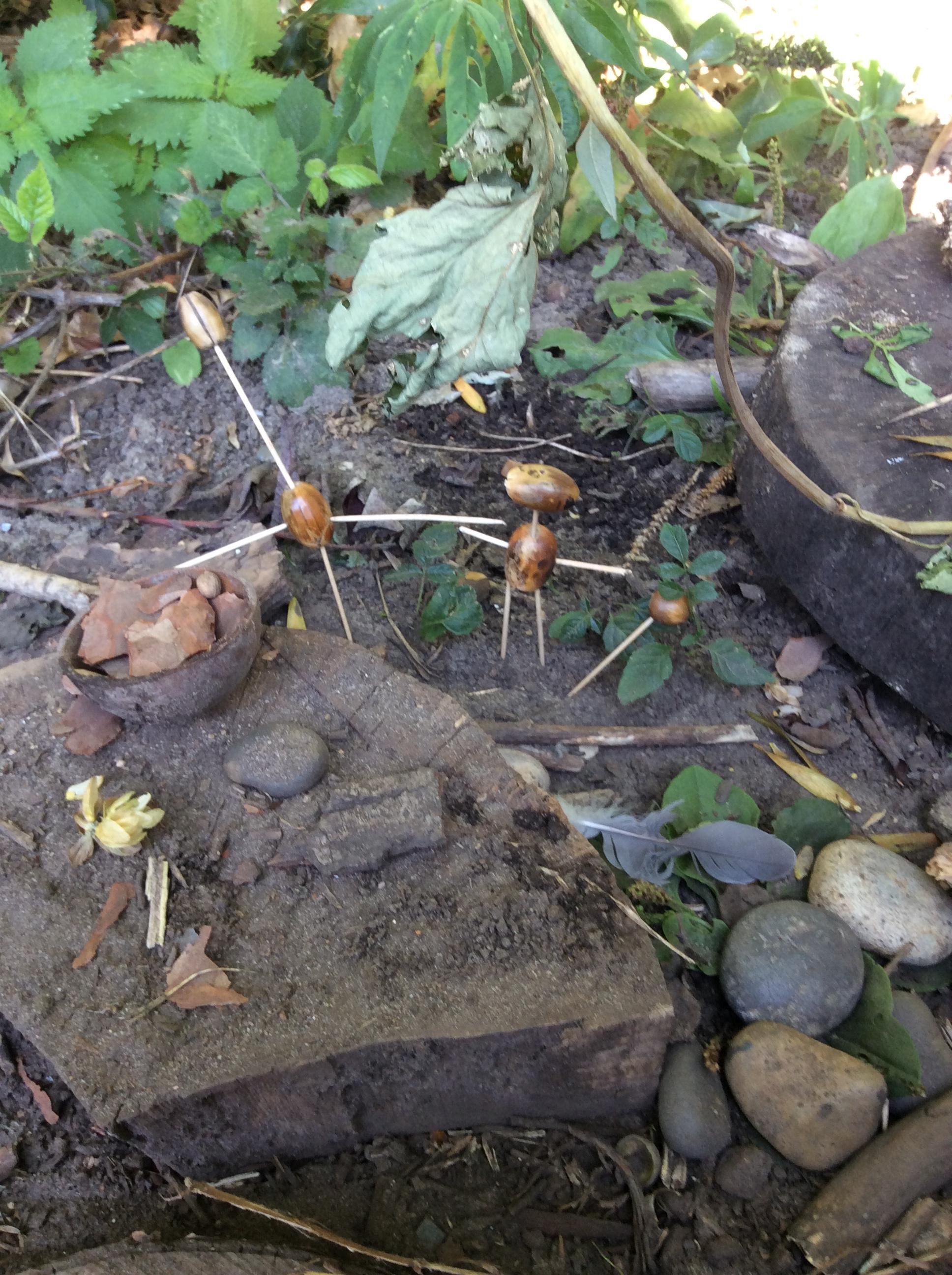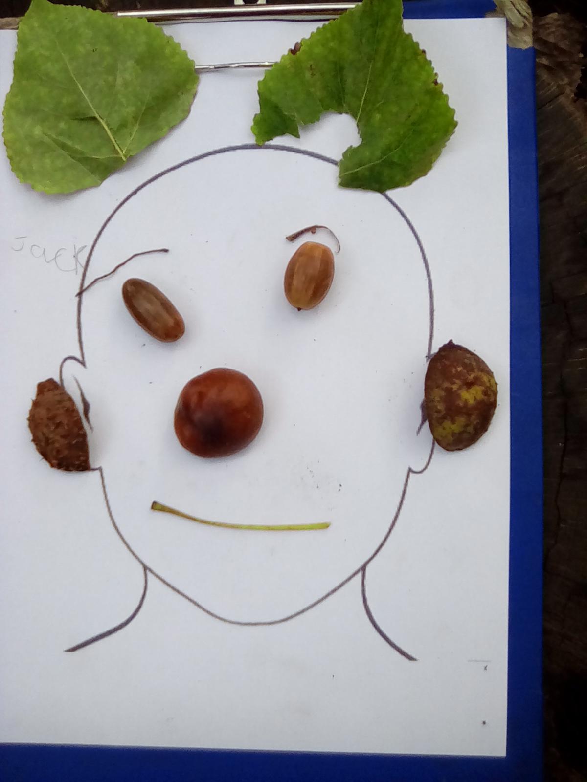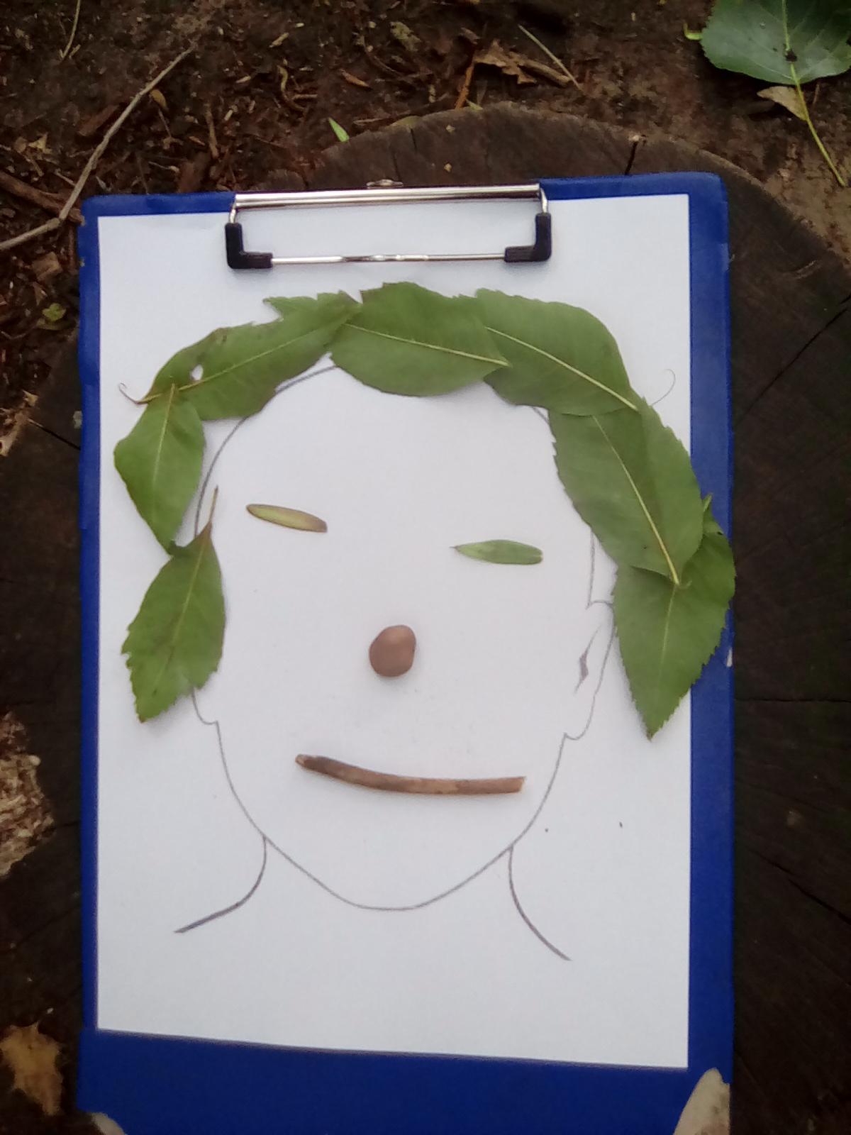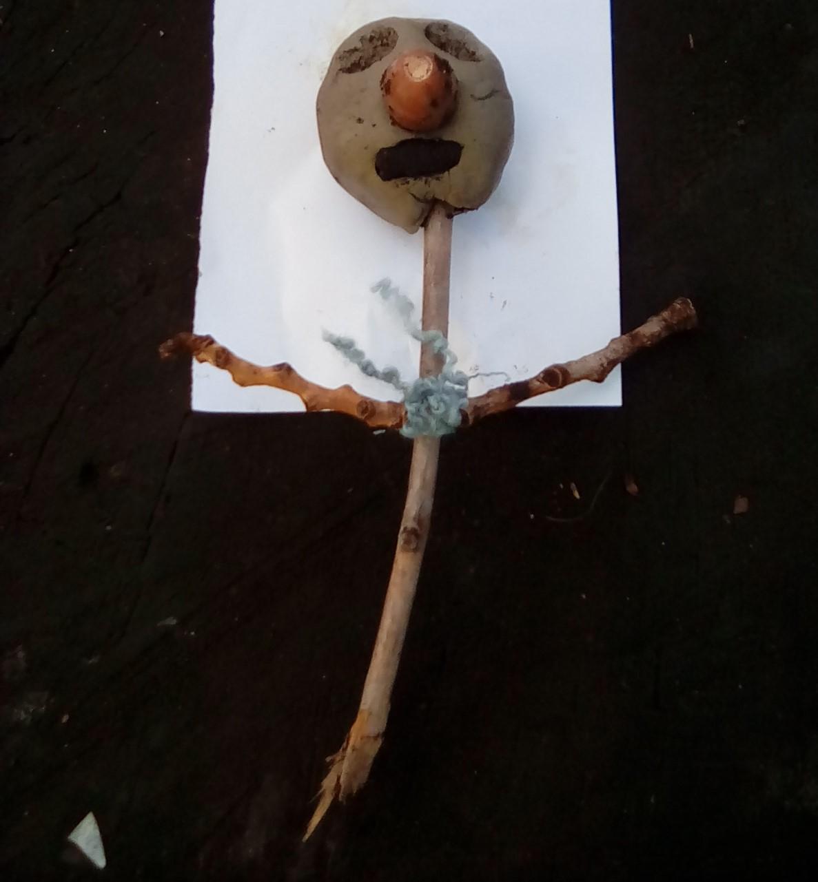 Wrens looked around the Forest for natural items with which to create facial features....leaves for hair, stones for eyes, sticks for mouths, seeds for earrings....!
