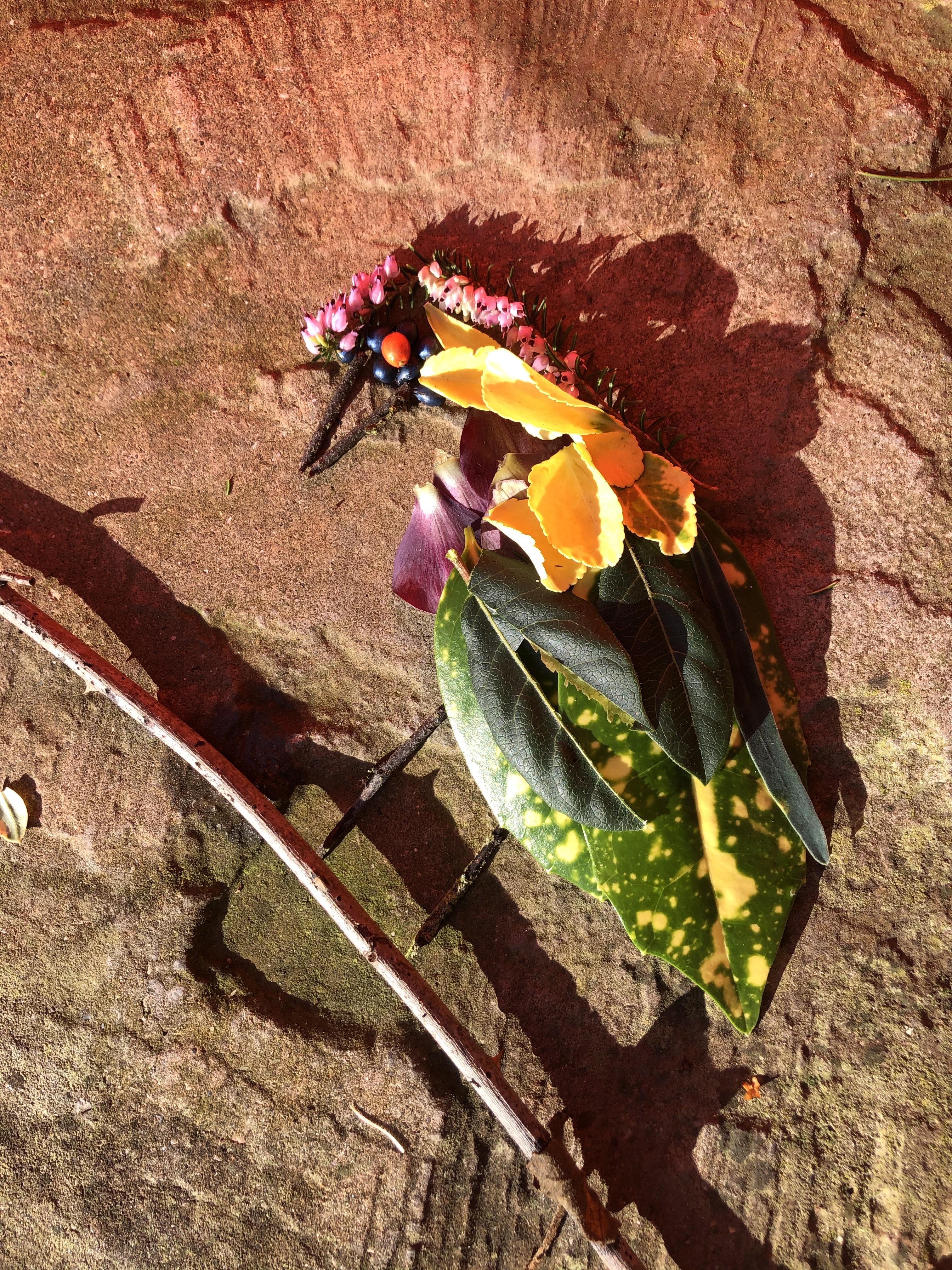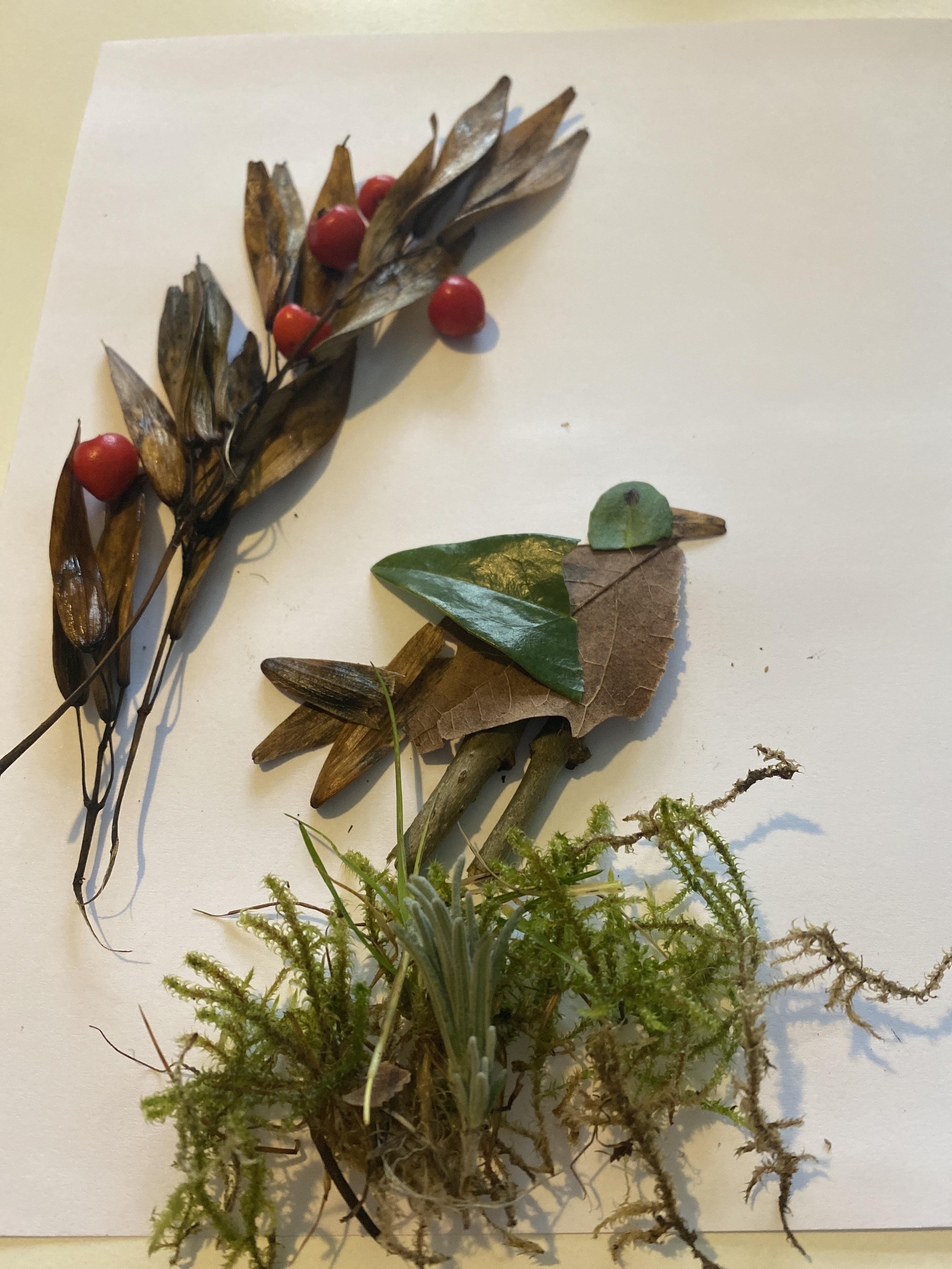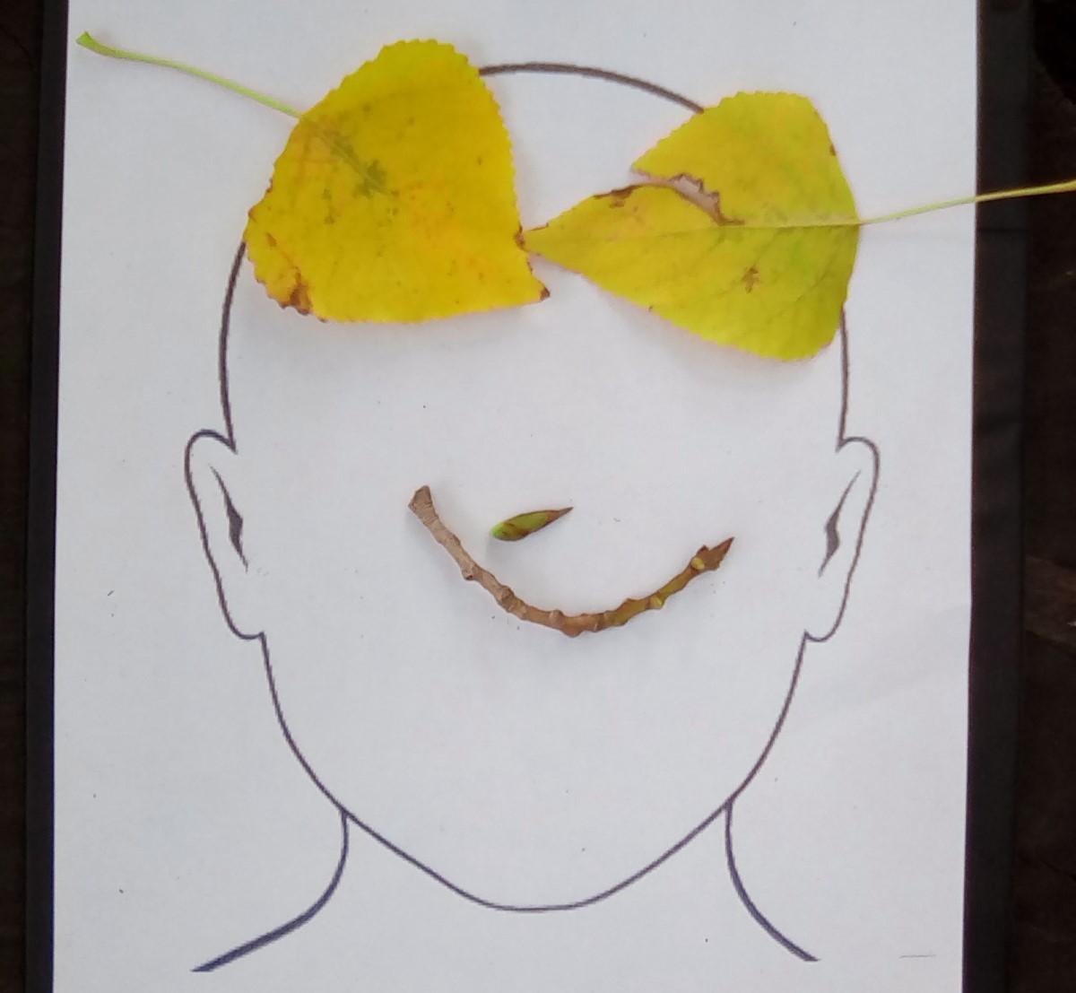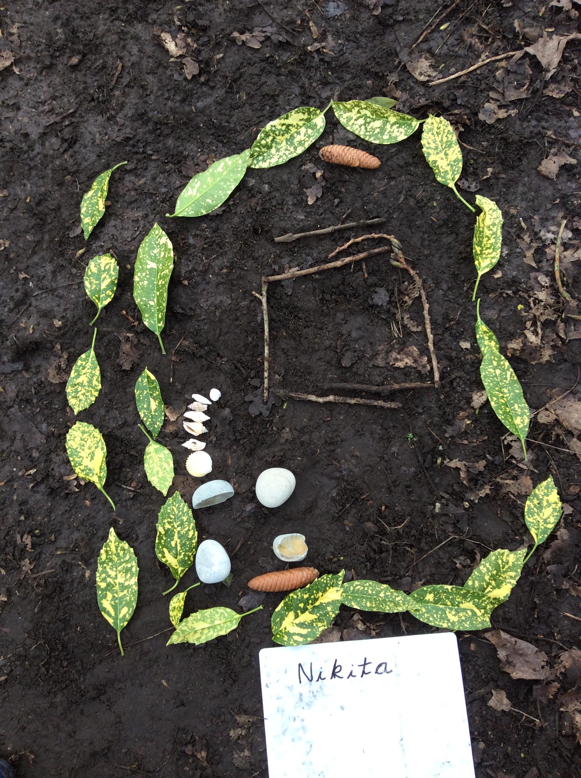 Wrens looked around the Forest for natural items with which to create facial features....leaves for hair, stones for eyes, sticks for mouths, seeds for earrings....!