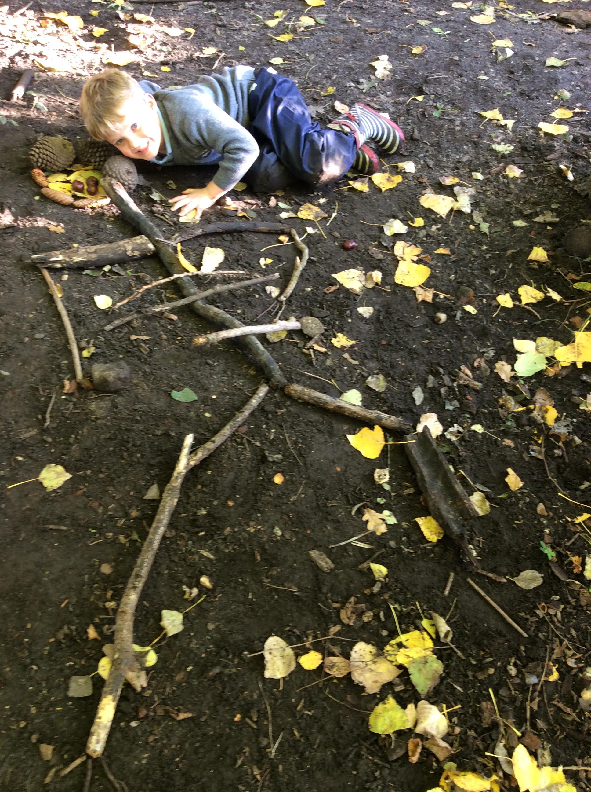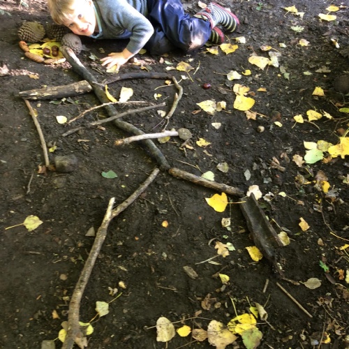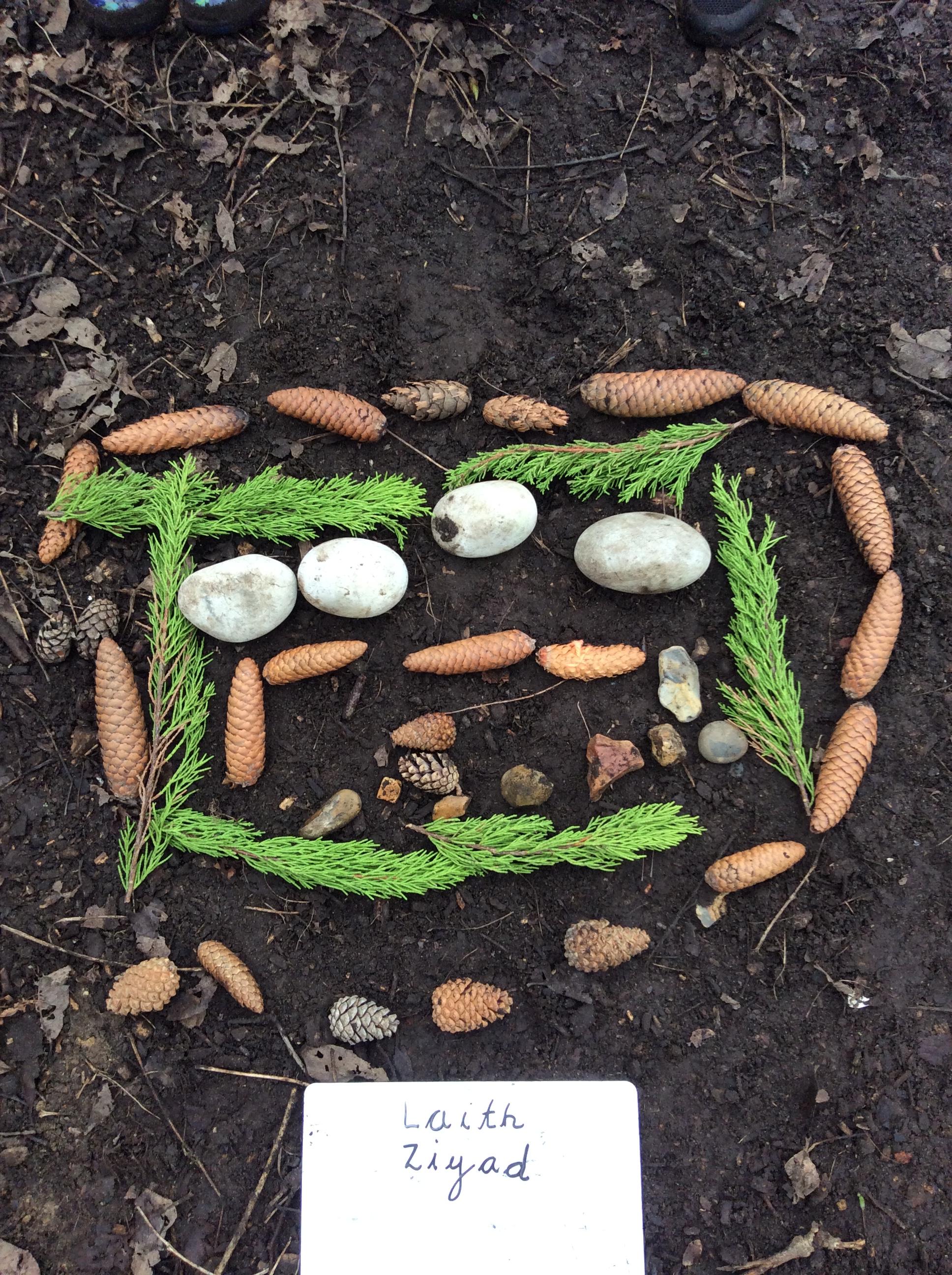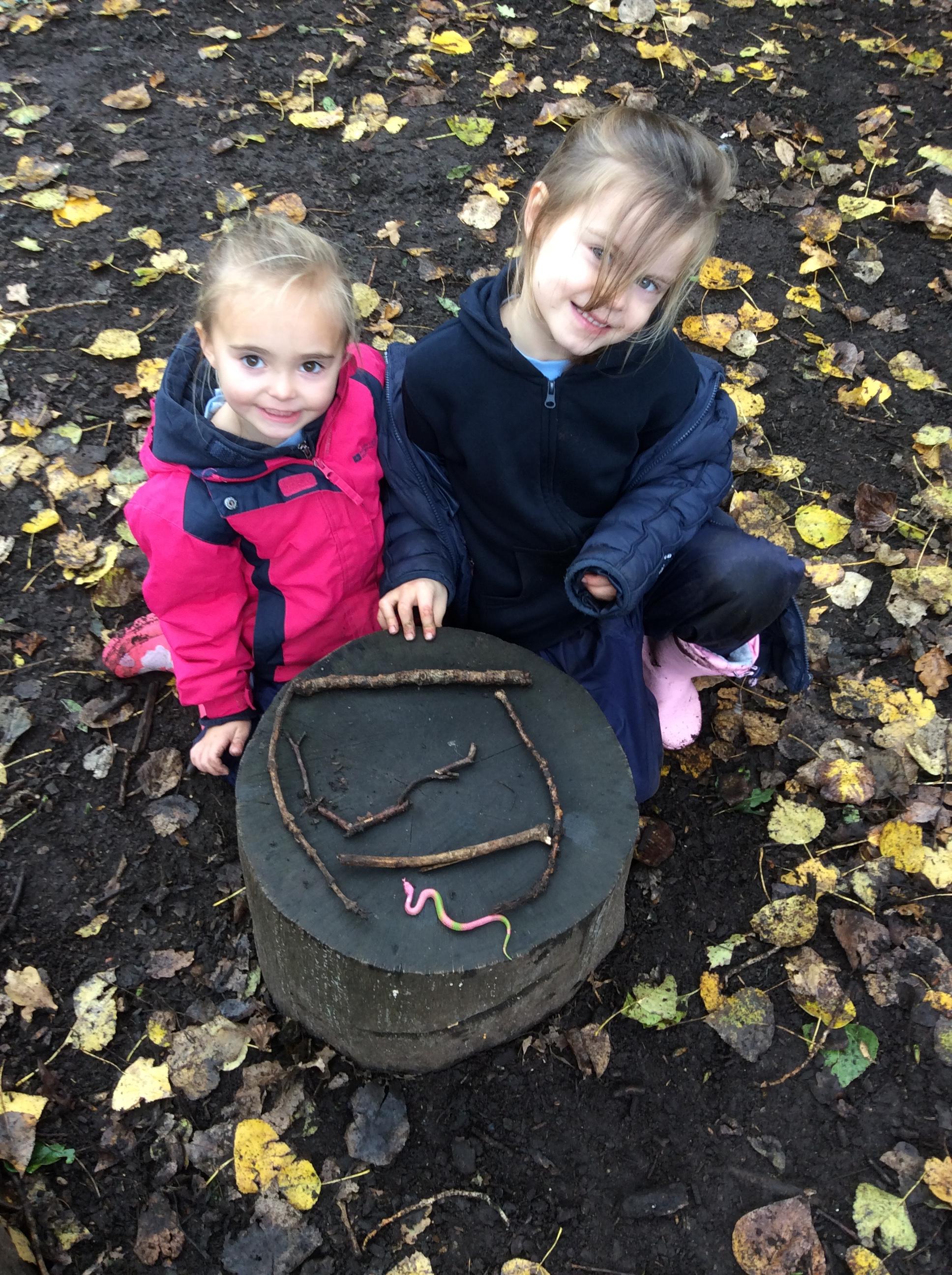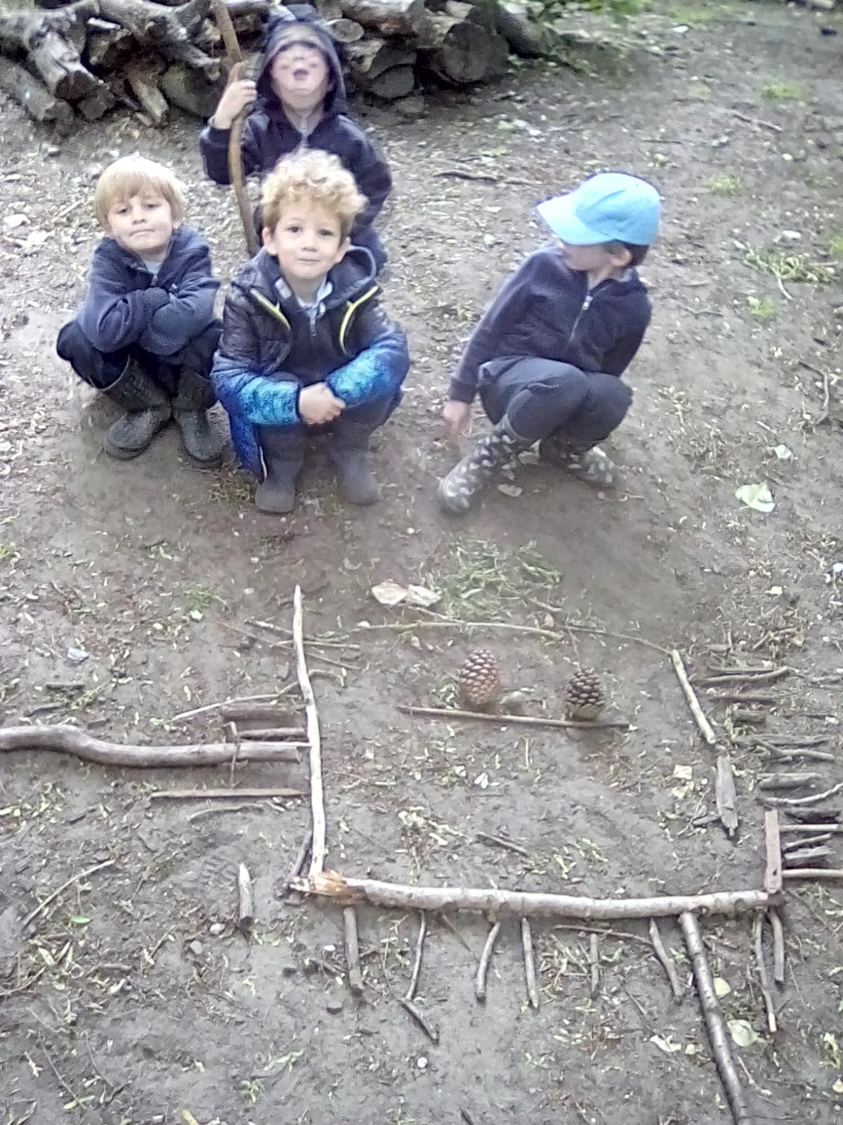 Another great day at Forest School with the Wrens. The children were invited to make some stick friends and then make them a home in the woods. I was really impressed with all the stick friends that were made ! We also had a go at using natural materials to make the different letters the children had been learning in class. Well done Wrens !