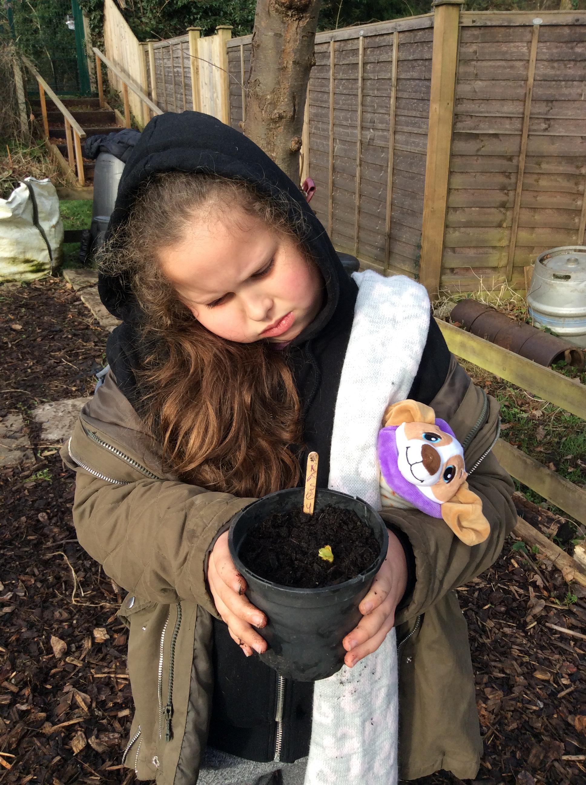 Once they were outside, the children got to know their sapling. They were given a sapling to explore and an ID sheet, where they had to work out what tree sapling they might have. They talked about what the sapling looked like now and then tried to find the matching adult tree from a selection of photos. Finally, the children planted their saplings with a partner.