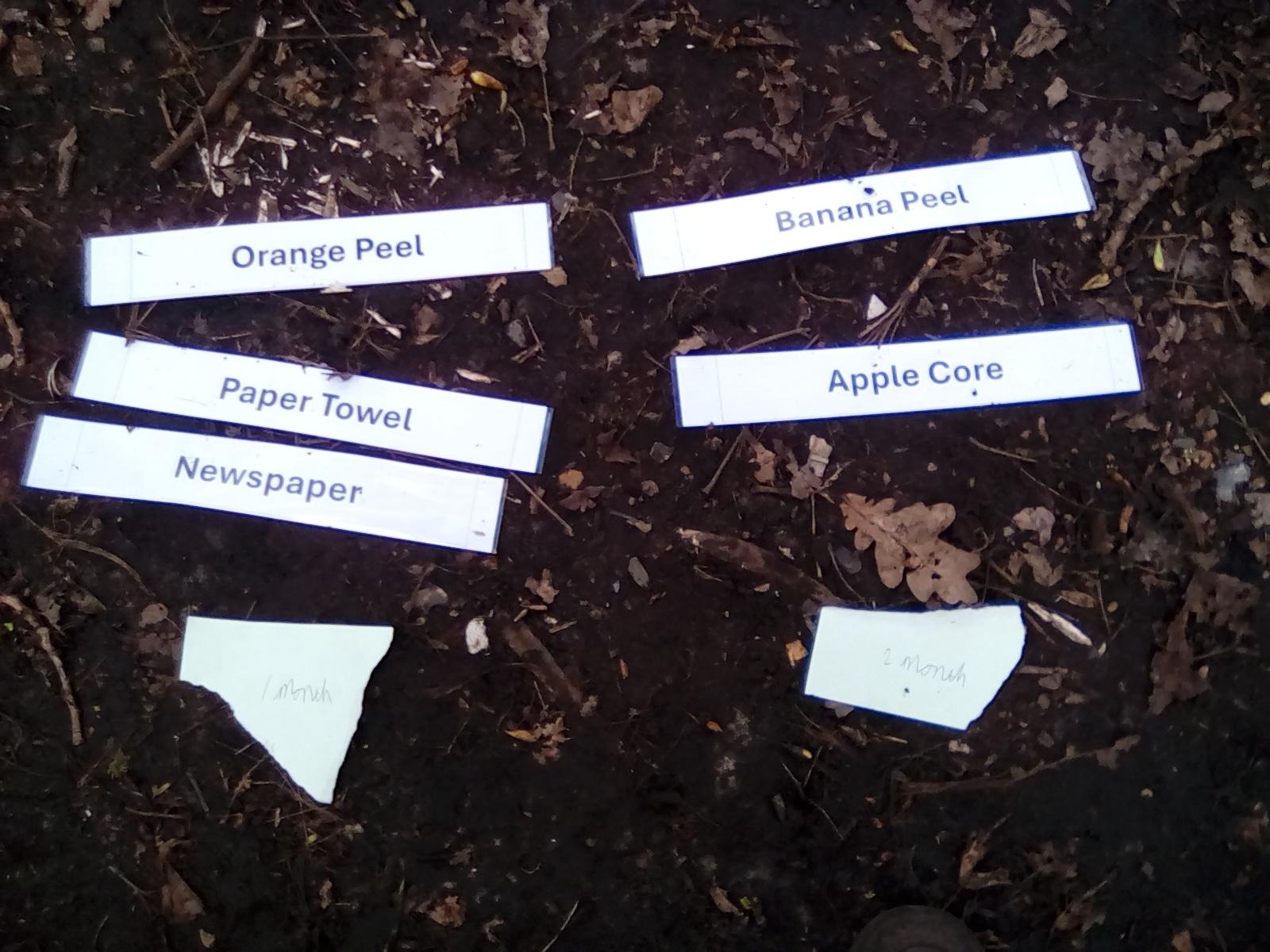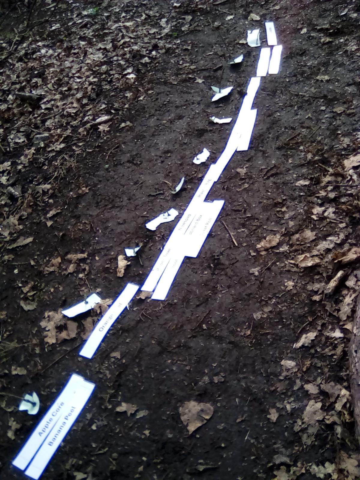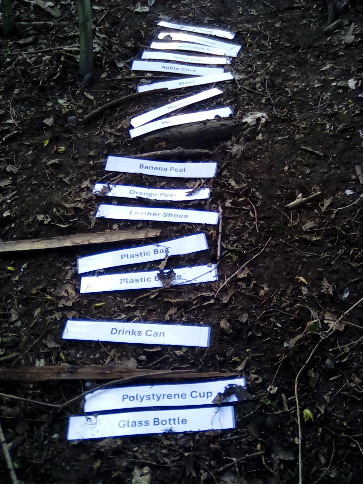 Inspired by the visiting author and her book. Doves collected different litter and in groups, after much deliberation, created a timeline of decomposition. Do you think a banana skin, plastic bottle, cardboard box, carrier bag or glass jar would take the longest to decompose?