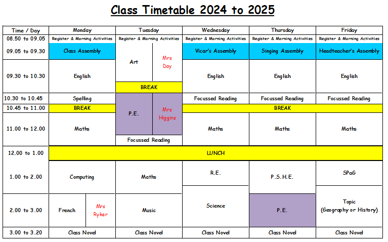 Please note that the Timetable has changed for Year 5. Most of it remains the same, however, there has been a change in P.E. Days to Tuesday and THURSDAY.