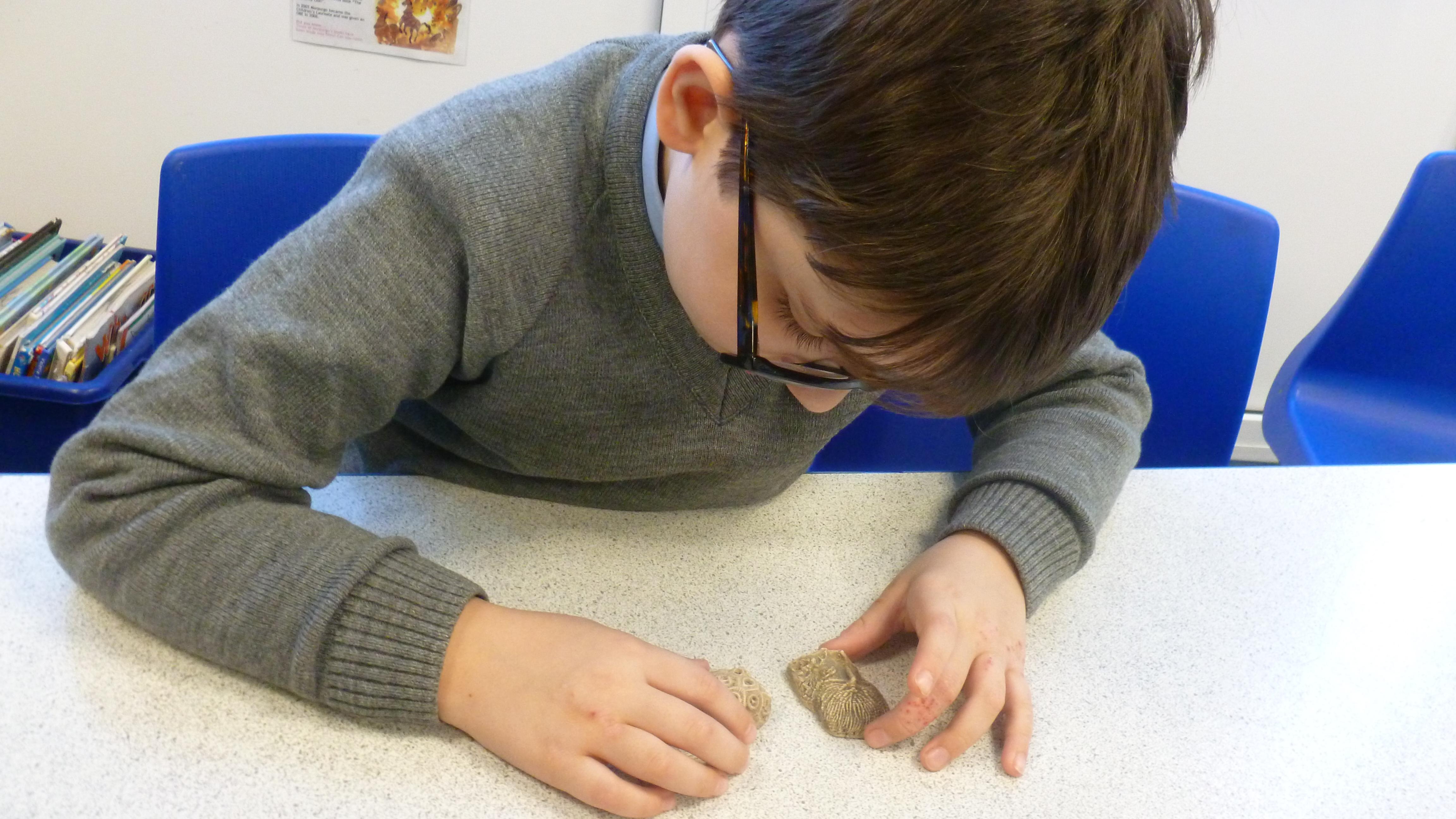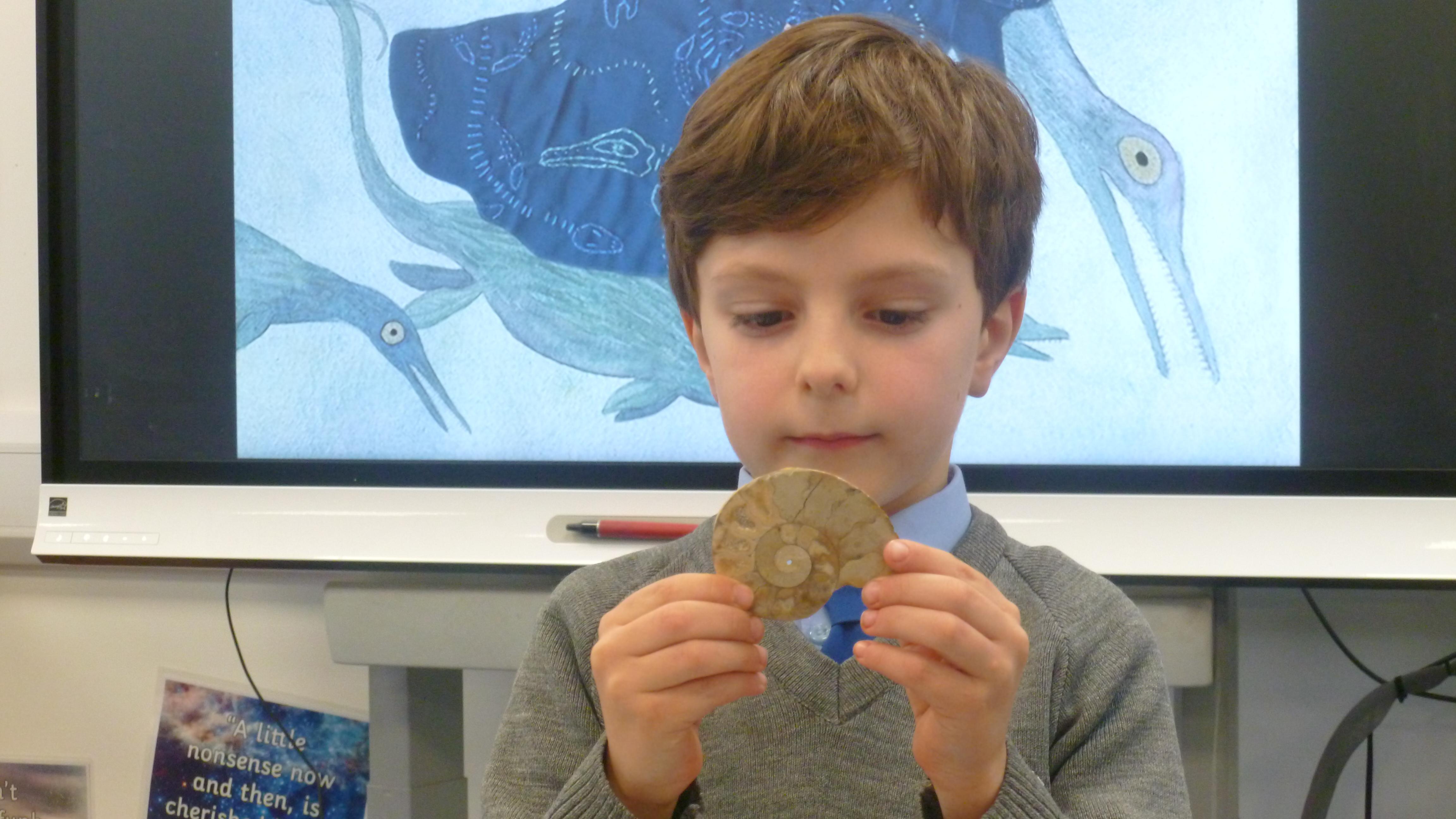 The children have explored and handled some replica and real fossils. We are also privileged that a young man in our class has a particular interest in fossils and was kind enough to bring some from his vast collection at home. He spoke so eloquently and with such knowledge and the children were so fascinated by his specimens! We looked at: a trilobite, around 3-400 million years old, ammonites around 200 million years old, a Paleozoic Brachiopod around 450 million years old and a fossil of a dinosaur tooth around 100 million years old. There was even an example of 'coprolite', which, put simply is fossilised dinosaur poo!