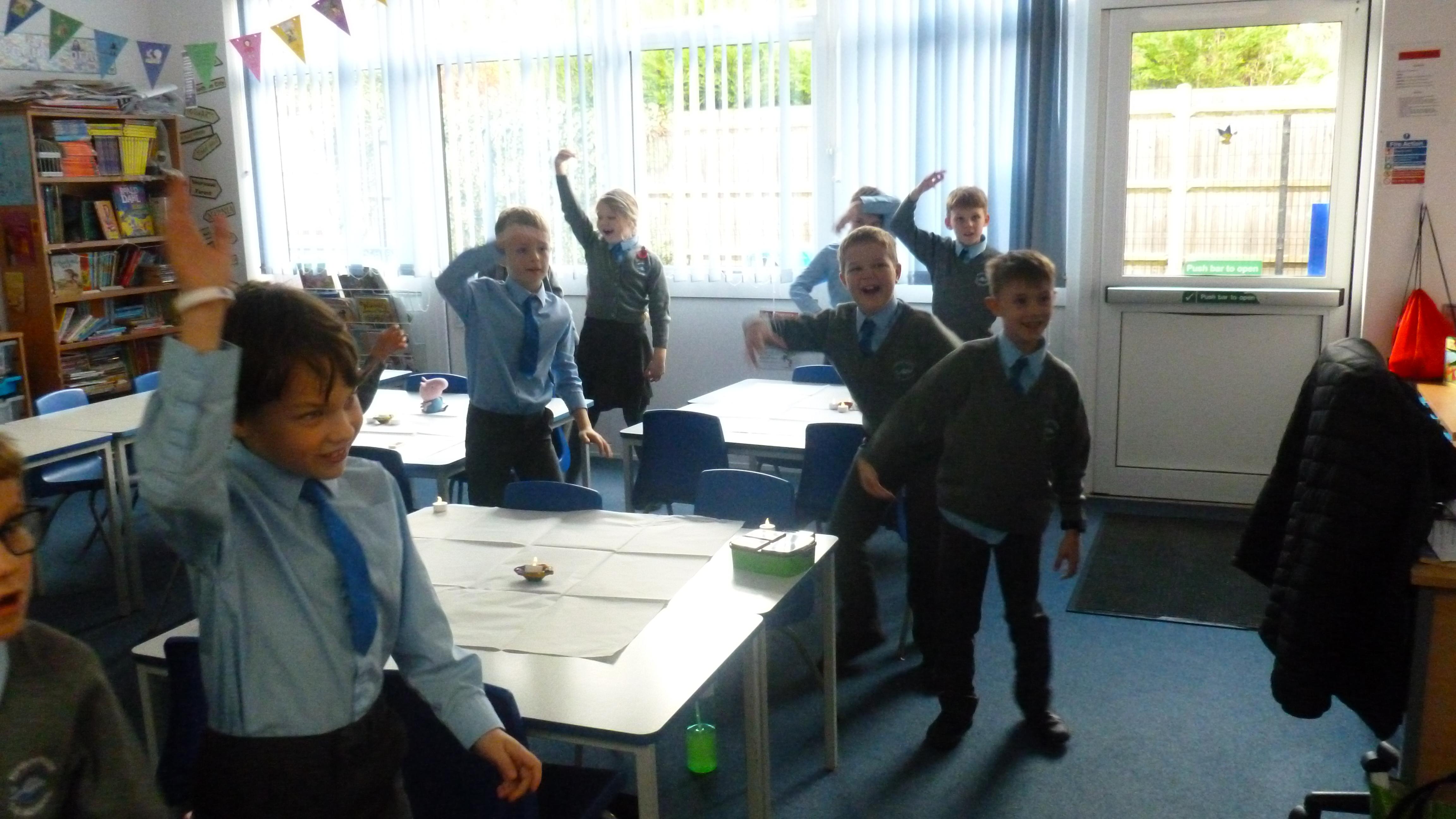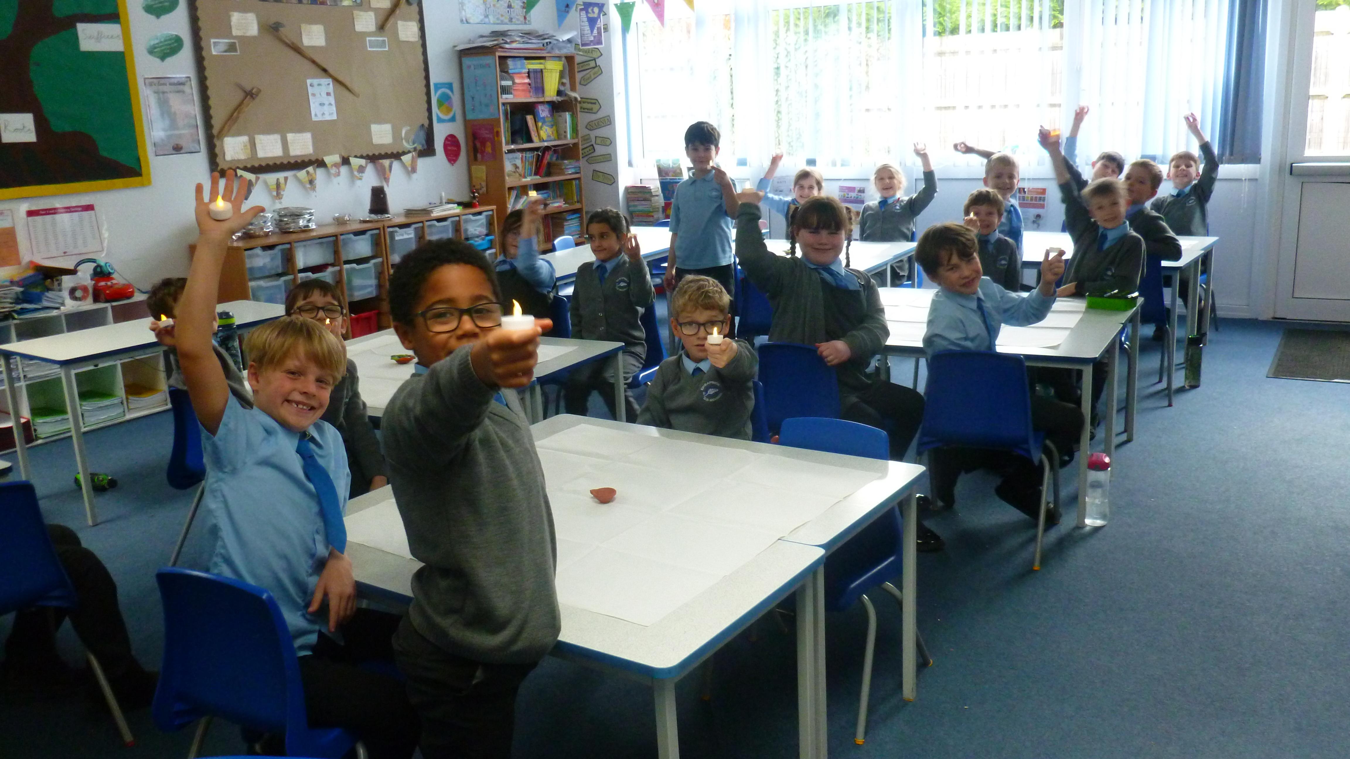 The children were then surprised with a Diwali celebration in class, which was an immersive experience to support them in understanding how a Hindu child might feel during this celebration. Strings of lights lit up the classroom and authentic clay candle holders (diwas or diyas) were placed around the classroom. Each with their own candle (non-flame of course!), the children took part in some Indian dancing. We then watched a spectacular laser light show and fireworks display online and listened to traditional Indian music. During this, the children were treated to cake, sweets and squash and shared poppadom snacks. Finally, the children were able to answer their question, having experienced it a little themselves!
