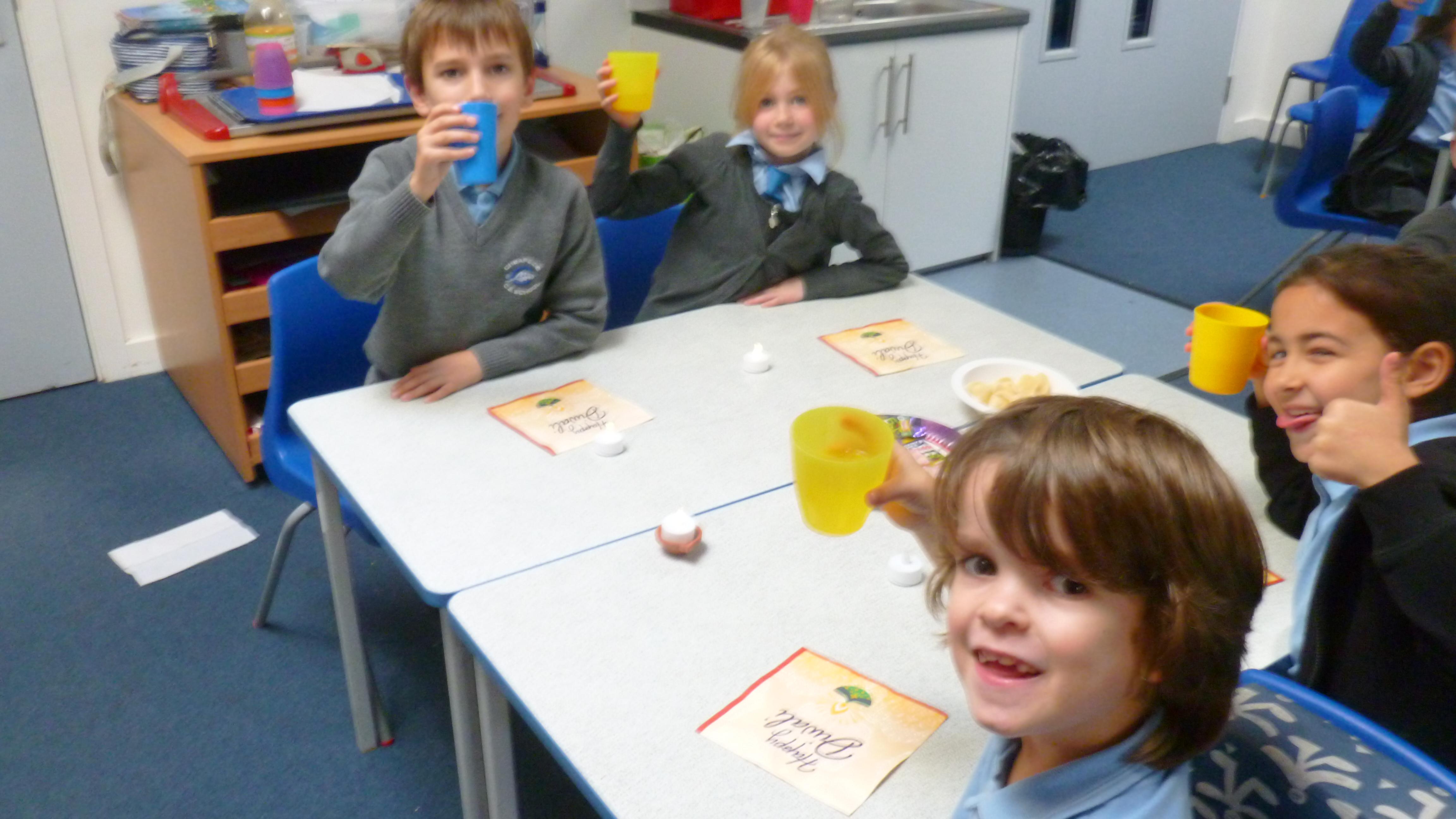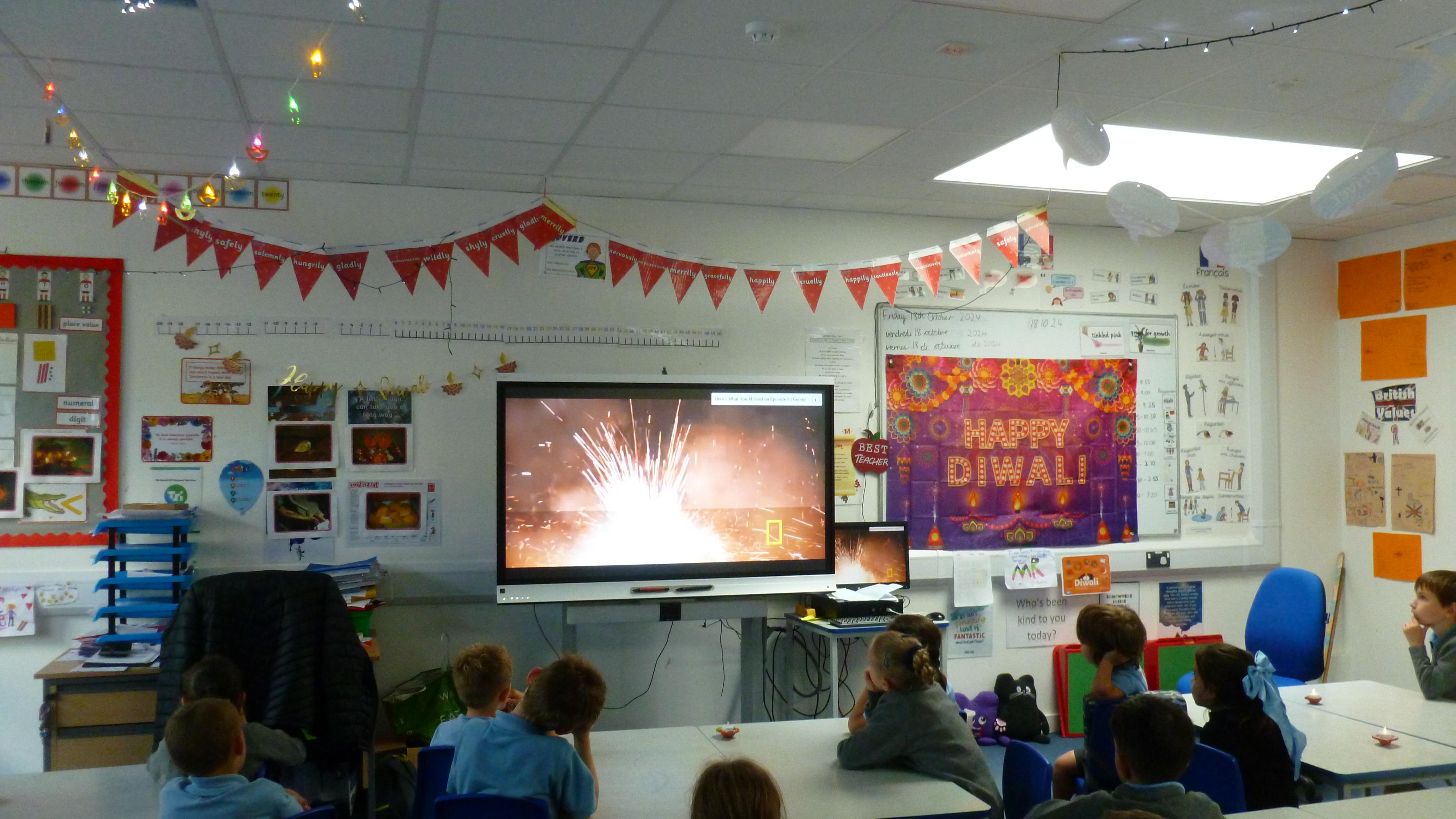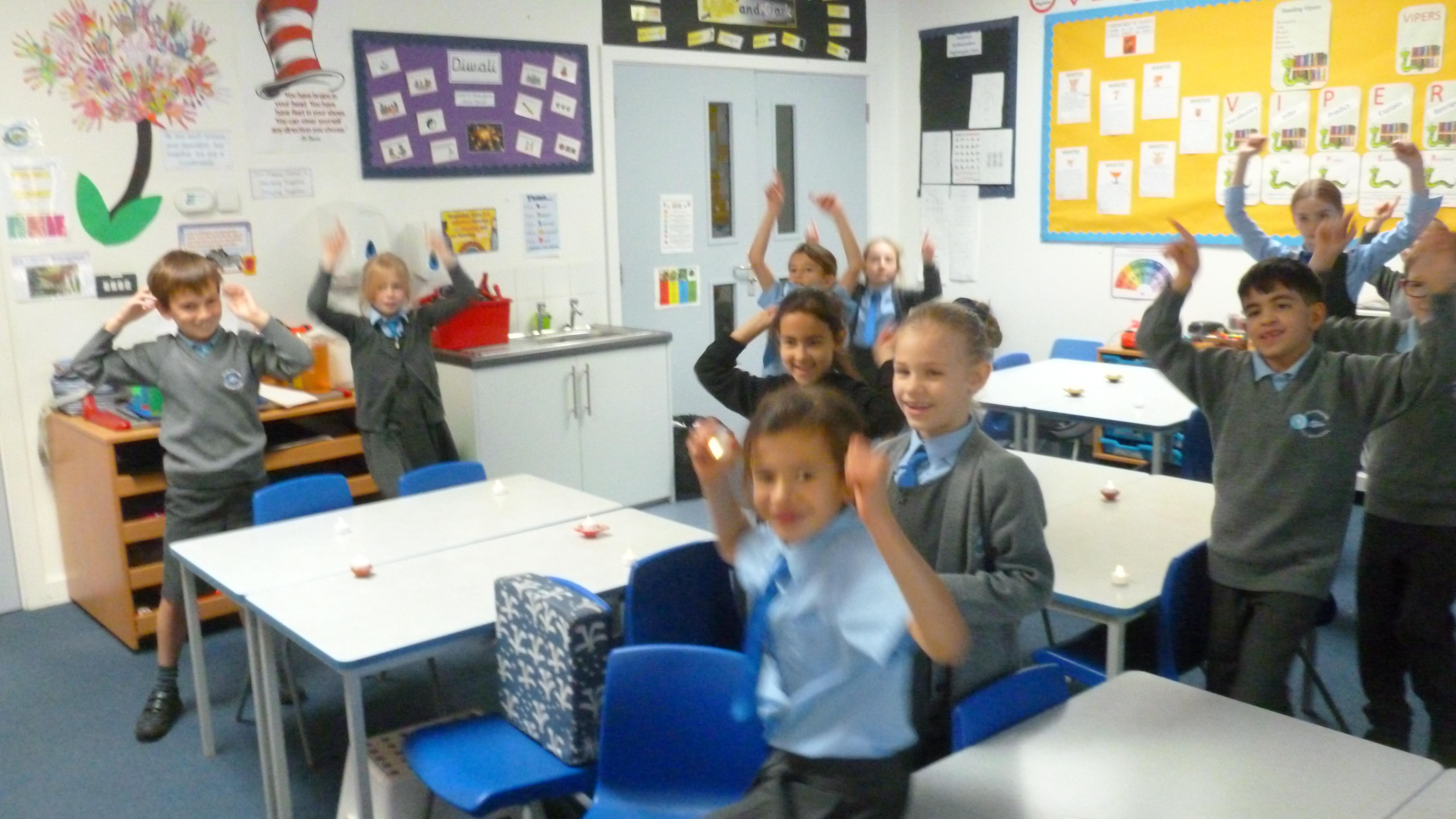 The children were then surprised with a Diwali celebration in class, which was an immersive experience to support them in understanding how a Hindu child might feel during this celebration. Strings of lights lit up the classroom and authentic clay candle holders (diwas or diyas) were placed around the classroom and on the children's tables. Each with their own candle (non-flame of course!), the children took part in some Indian dancing, performing a fantastic Diwali dance. We then watched a spectacular laser light show and fireworks display online and listened to traditional and more modern Indian music. During this, the children were treated to a Diwali feast of cake, chocolate, poppadom snacks, crisps and squash.