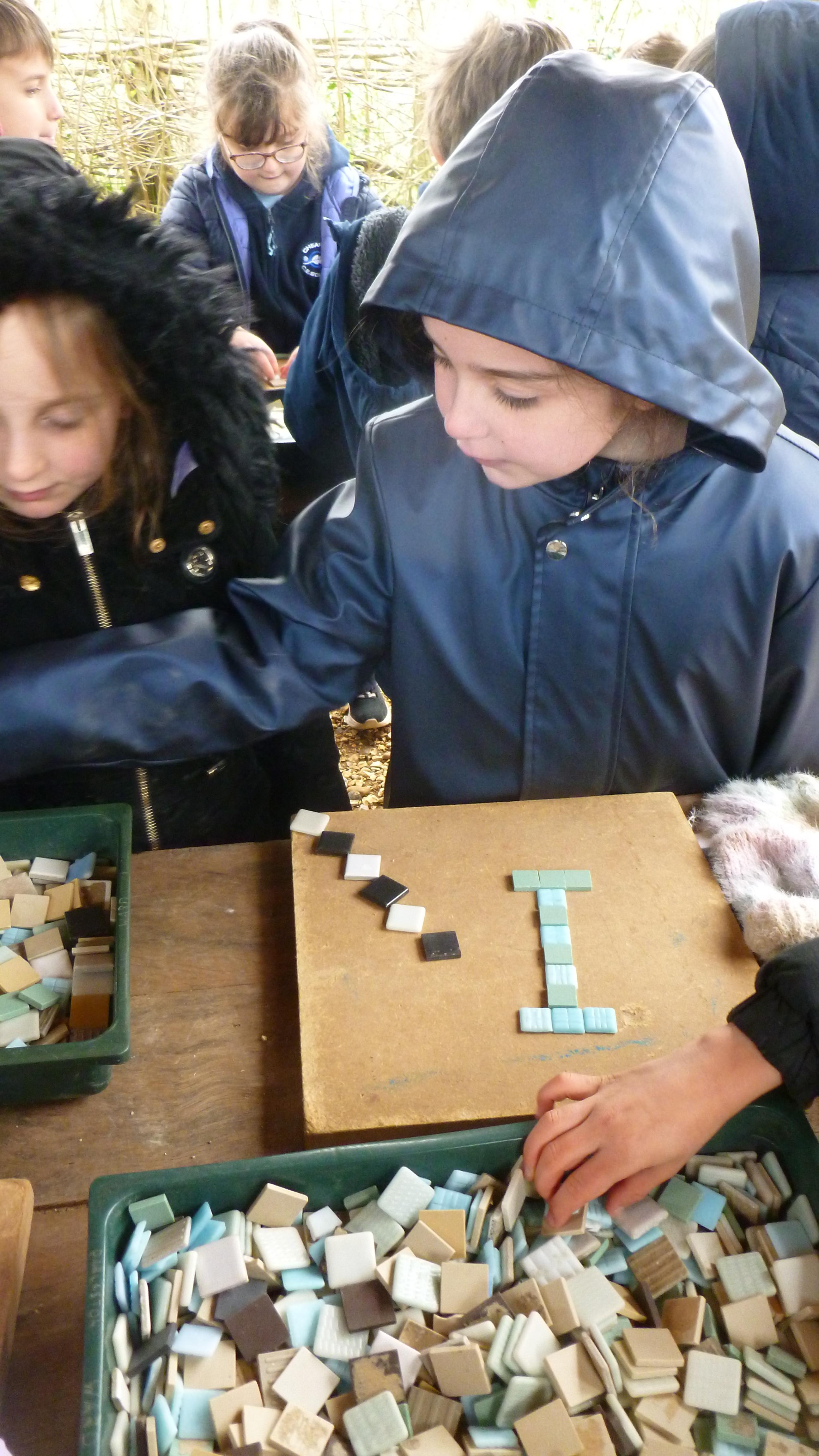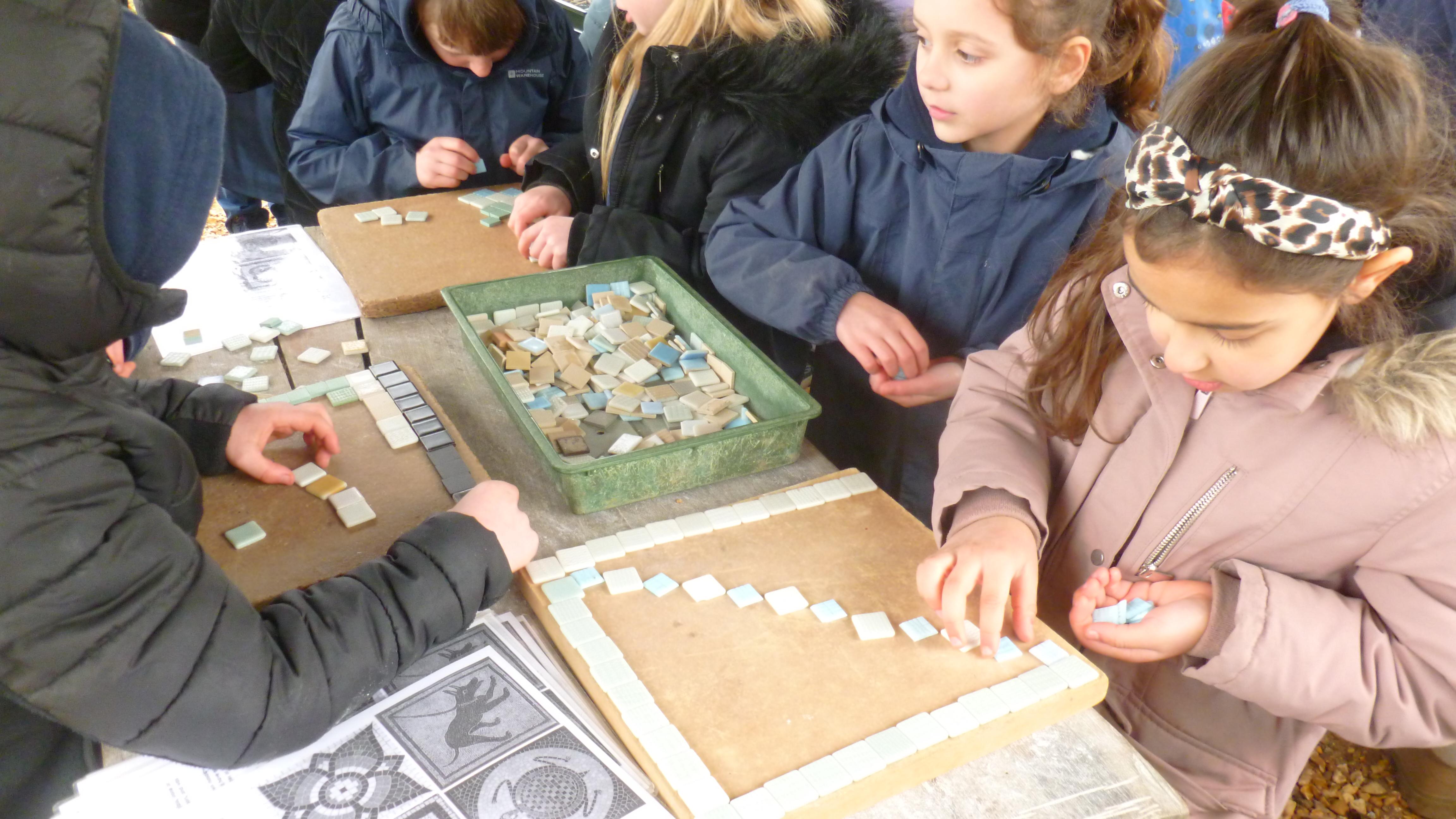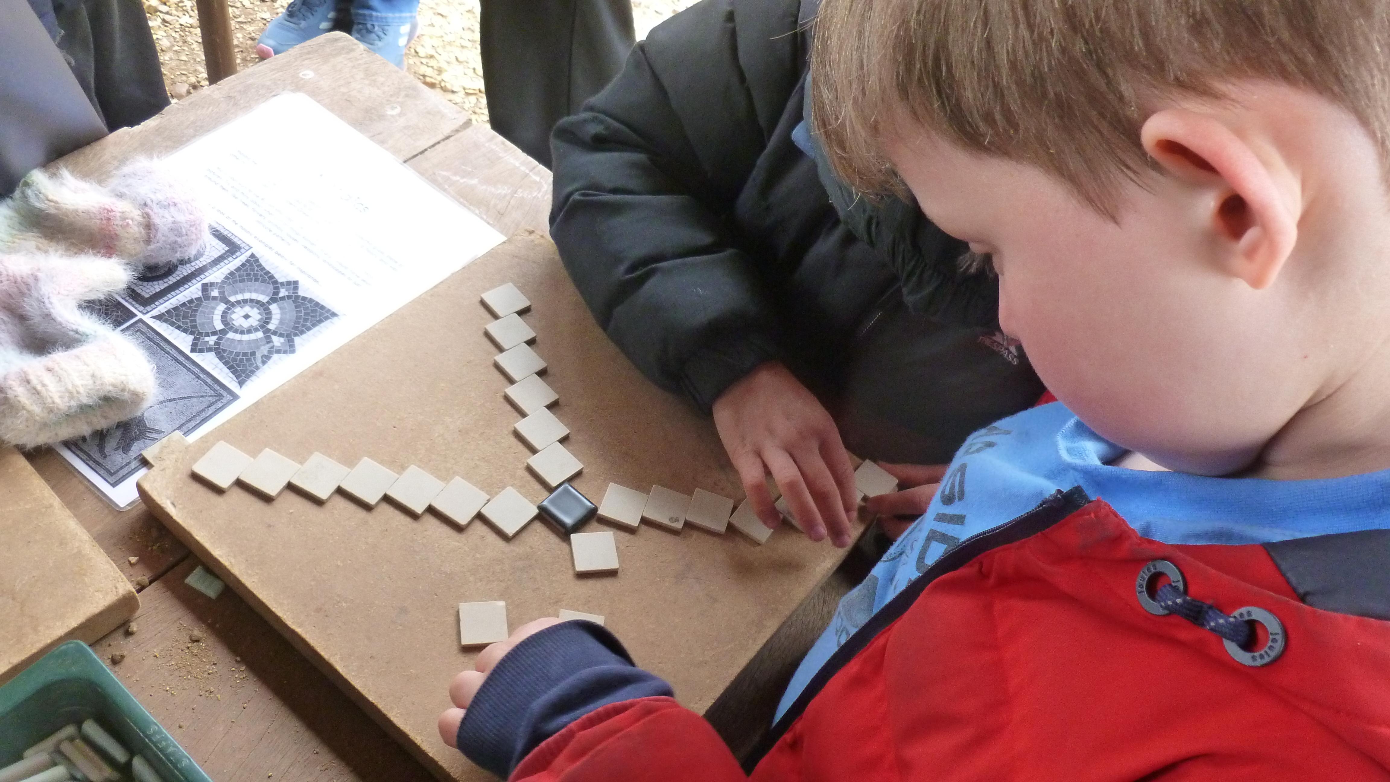 After lunch, we designed and created mosaic patterns using coloured tiles, inspired by the recreated mosaic floor outside the villa. Following this, was a jewellery session in which the children enjoyed making either a ring or a bracelet out of copper wire. For the final activity, it was back to the roundhouse for a session exploring Roman artefacts.