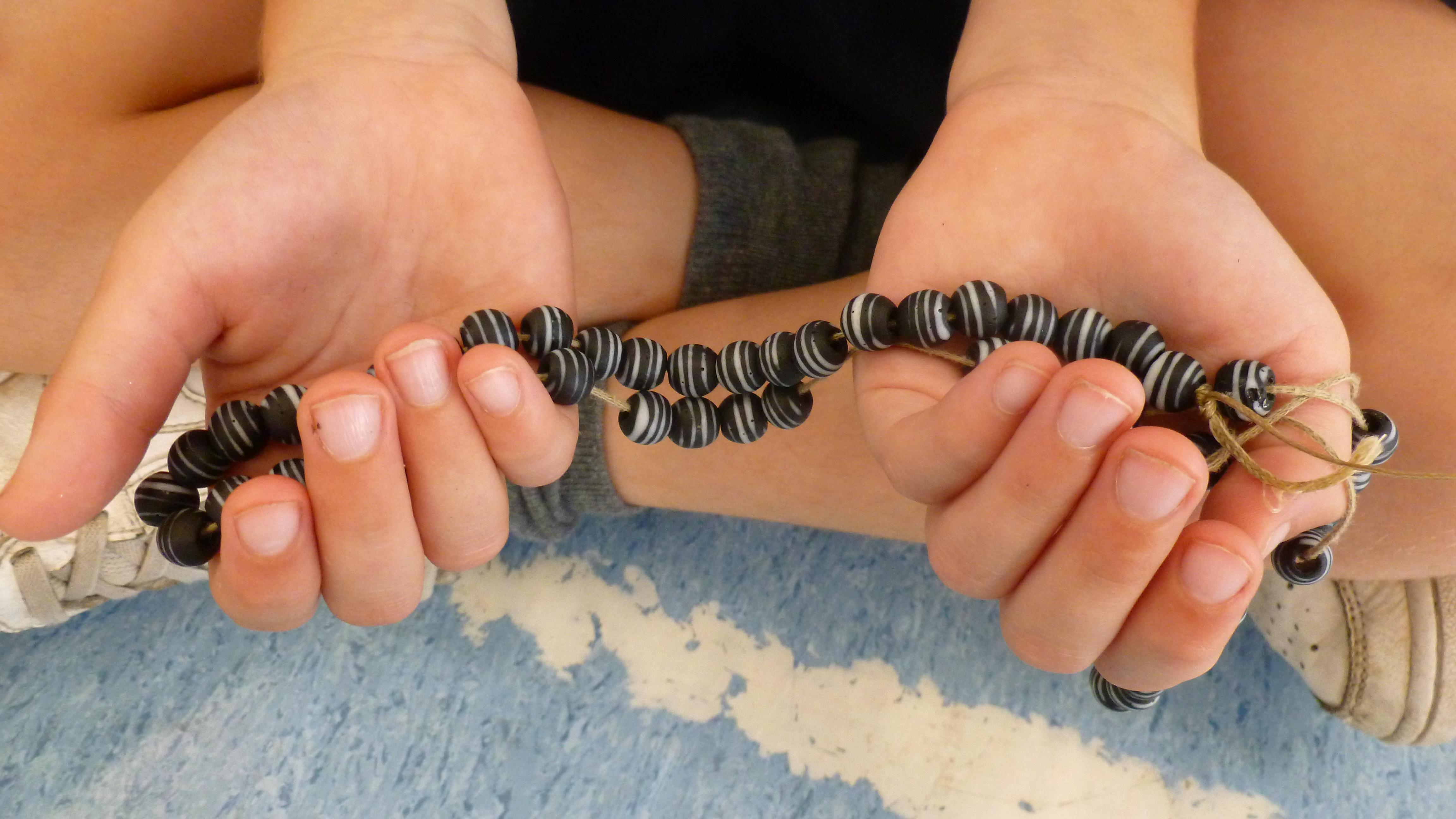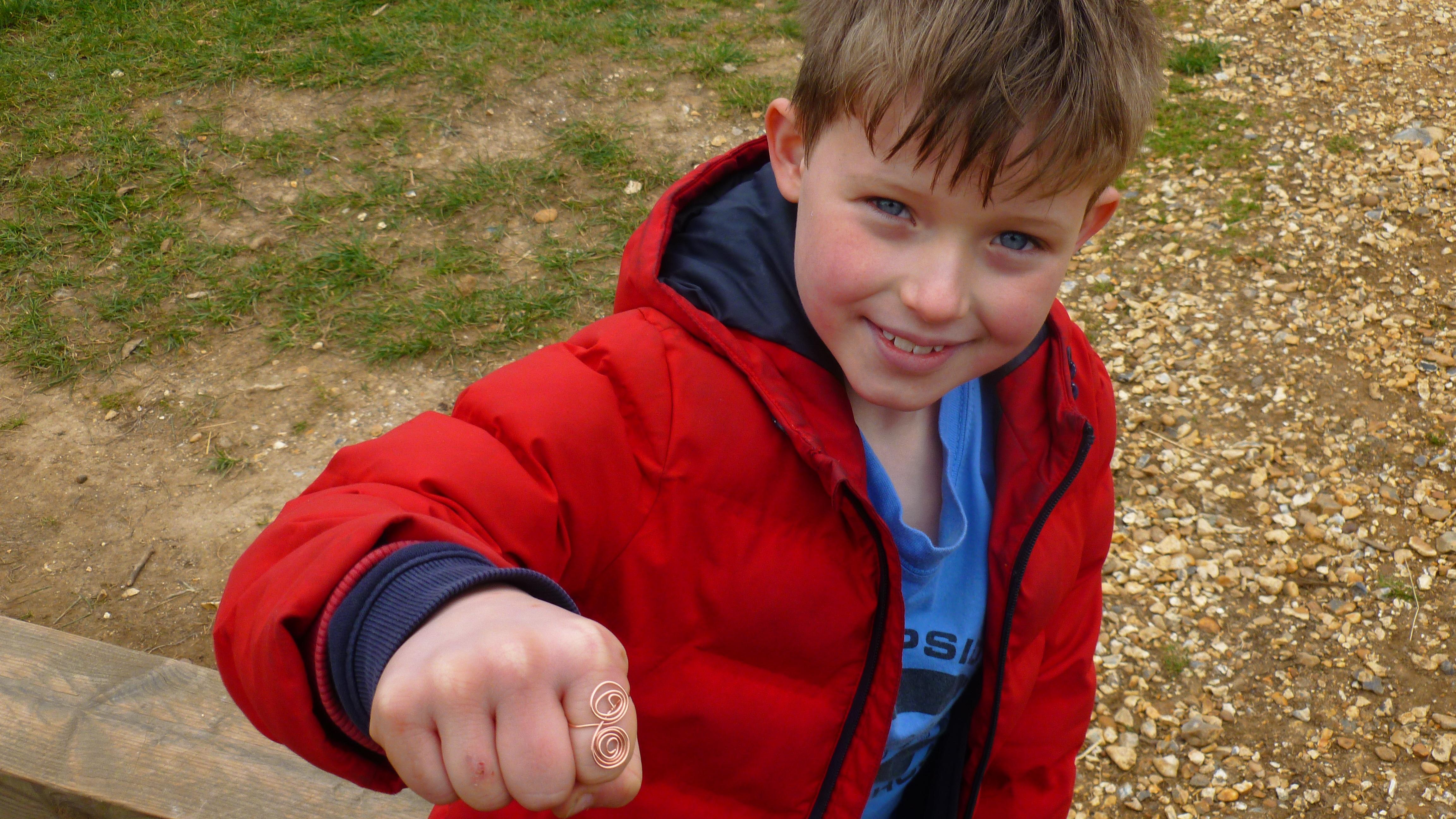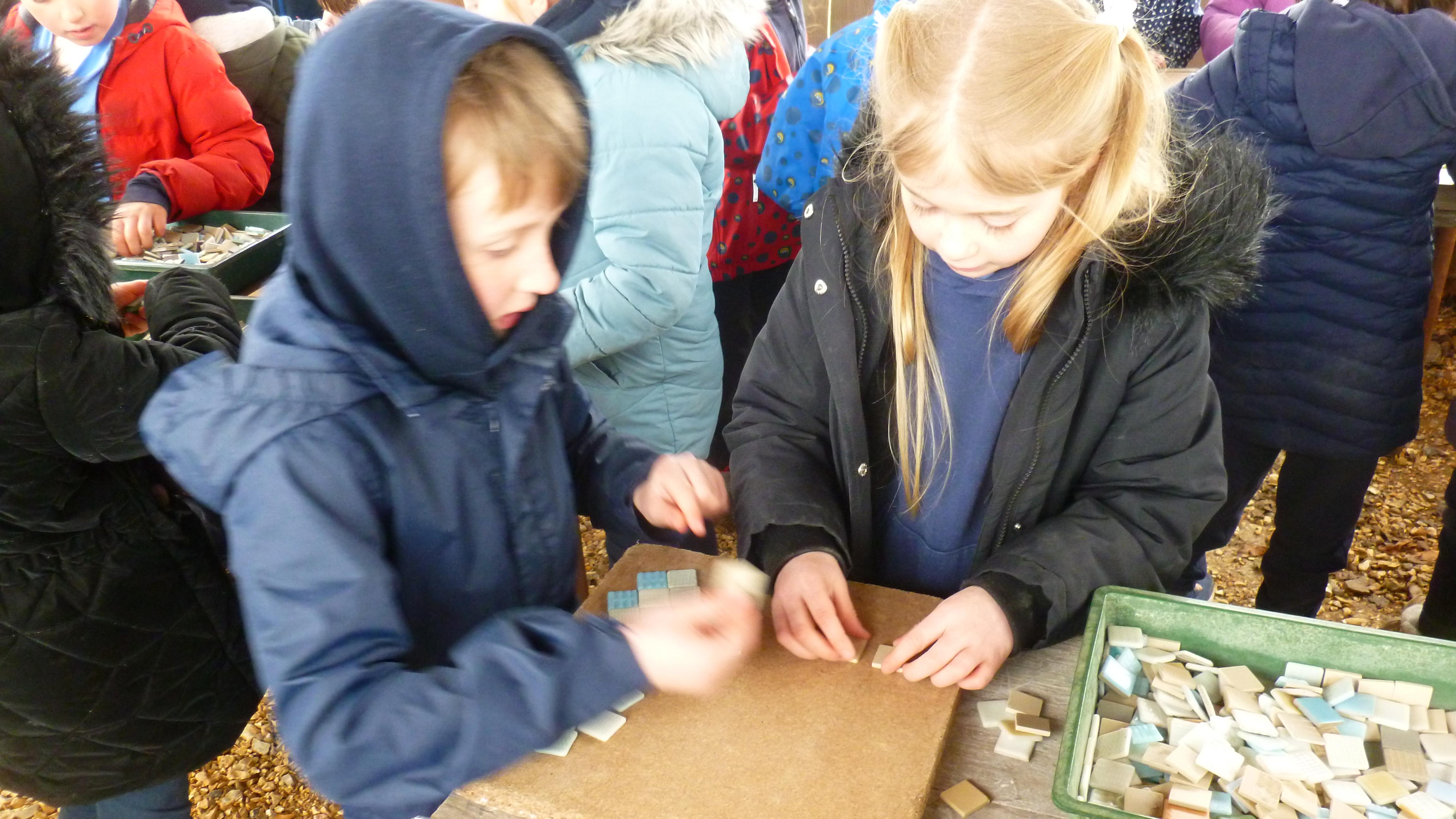 After lunch, we designed and created mosaic patterns using coloured tiles, inspired by the recreated mosaic floor outside the villa. Following this, was a jewellery session in which the children enjoyed making either a ring or a bracelet out of copper wire. For the final activity, it was back to the roundhouse for a session exploring Roman artefacts.