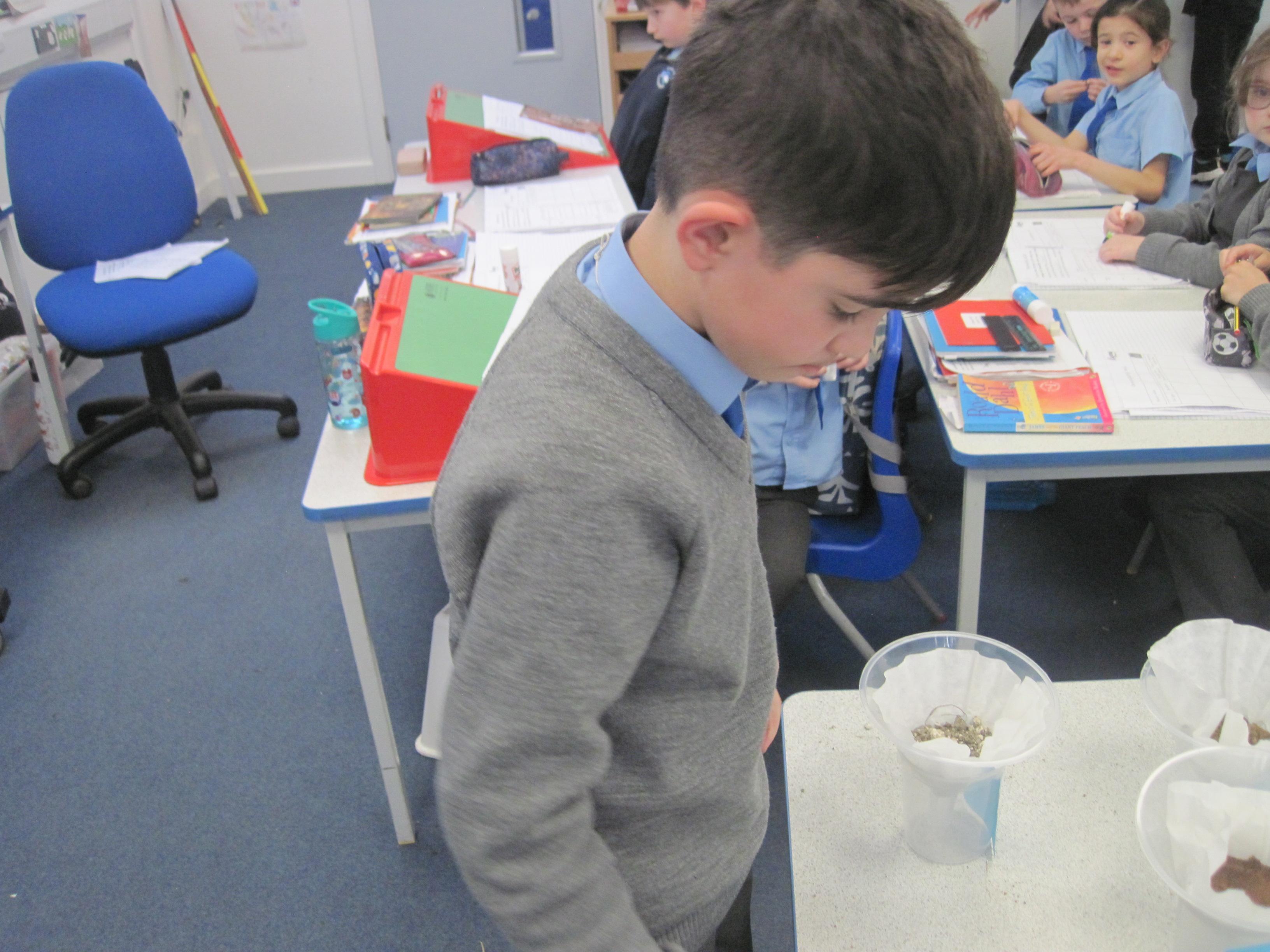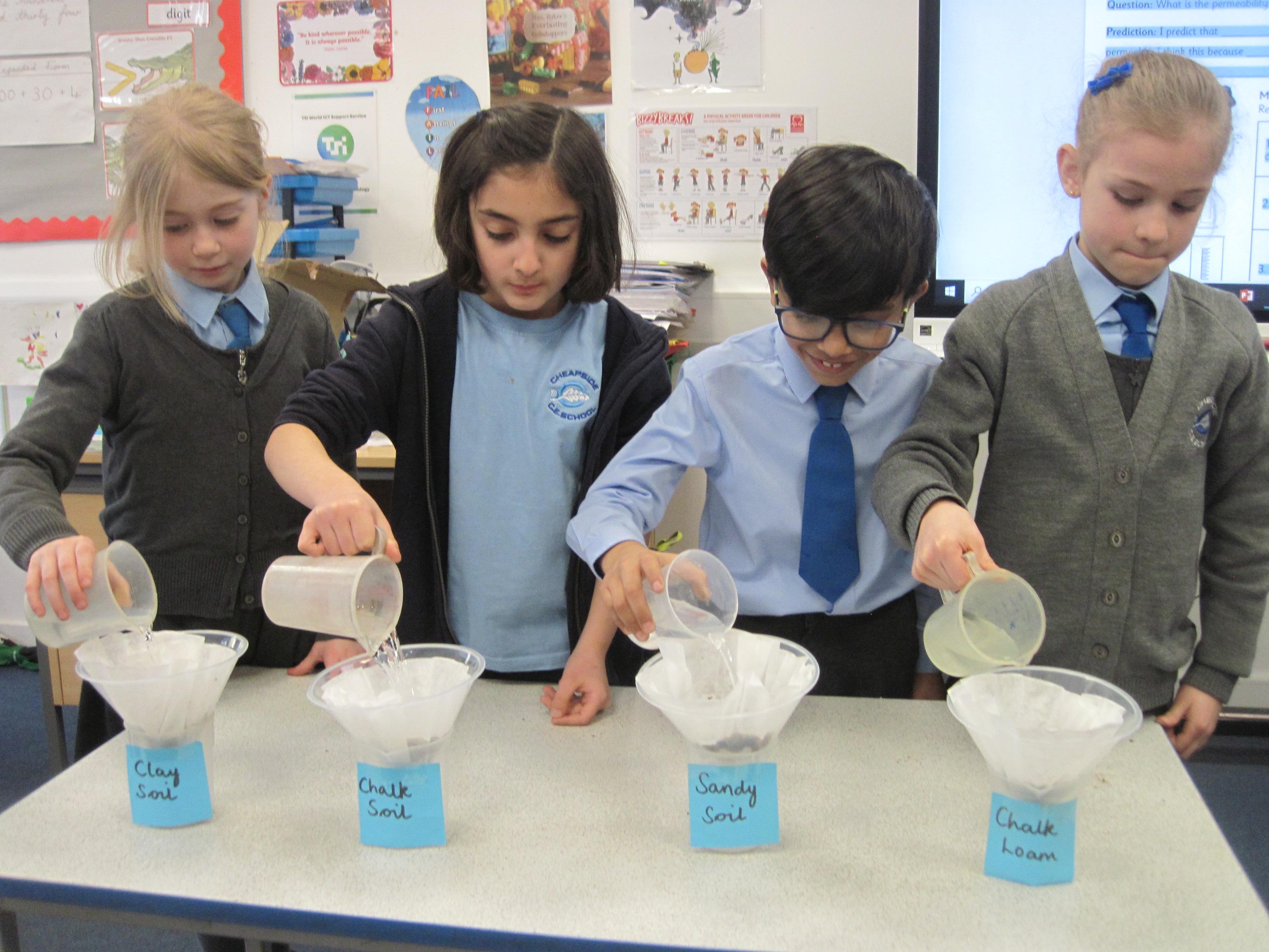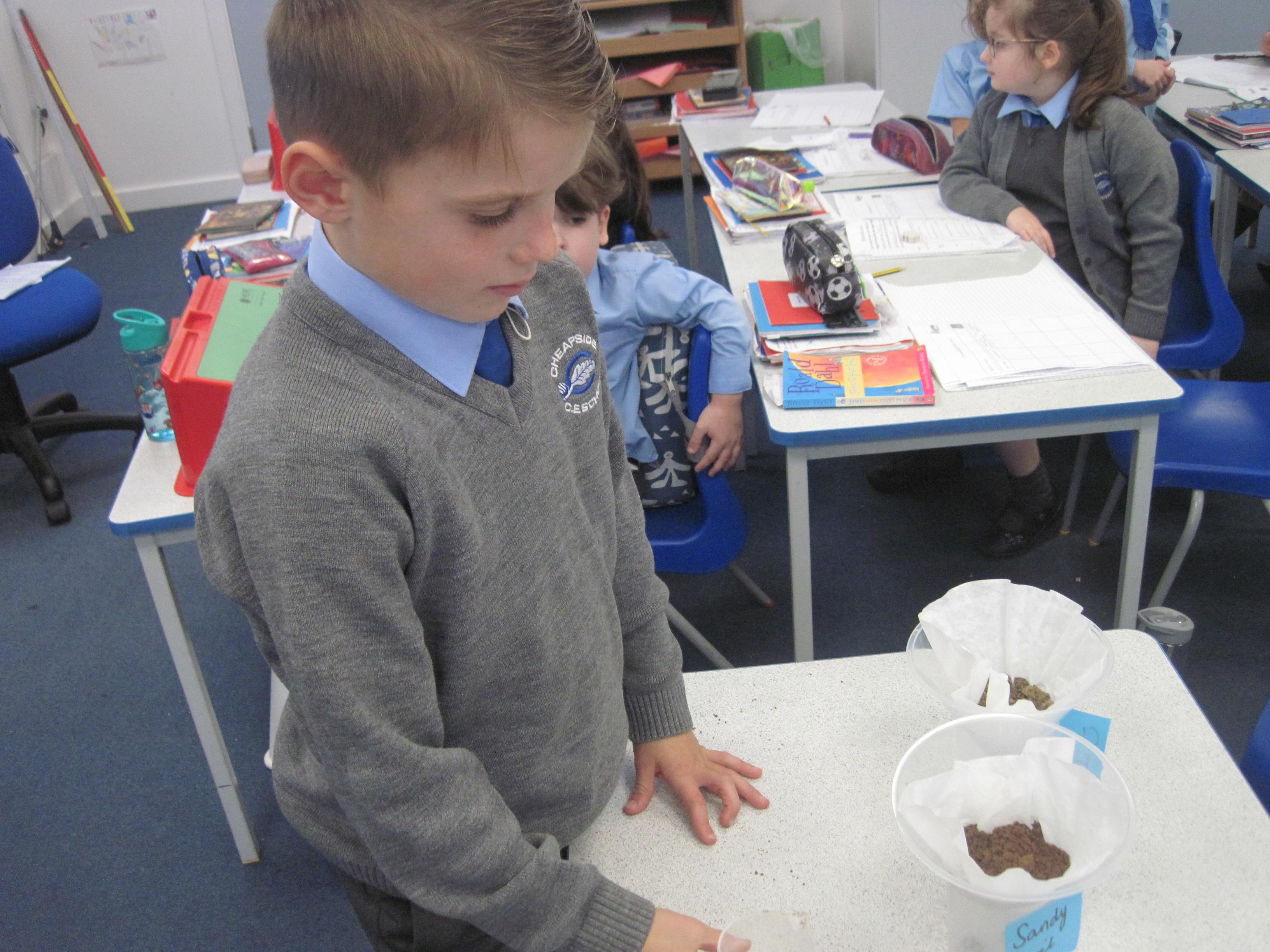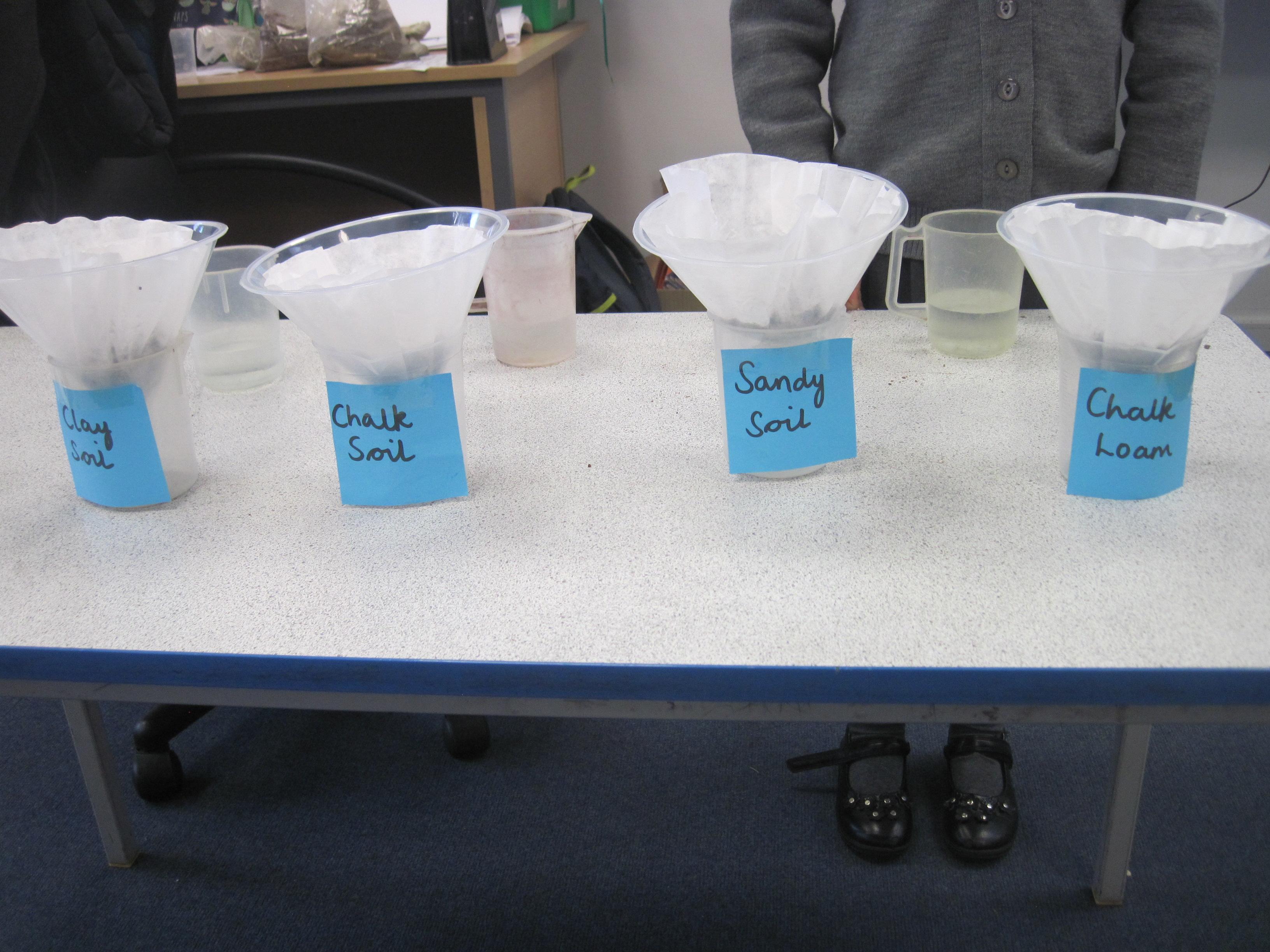 They then worked brilliantly, setting up the investigation, making observations and then recording. Our results showed that the Sandy Soil drained the quickest, with the Chalk soil draining the slowest.