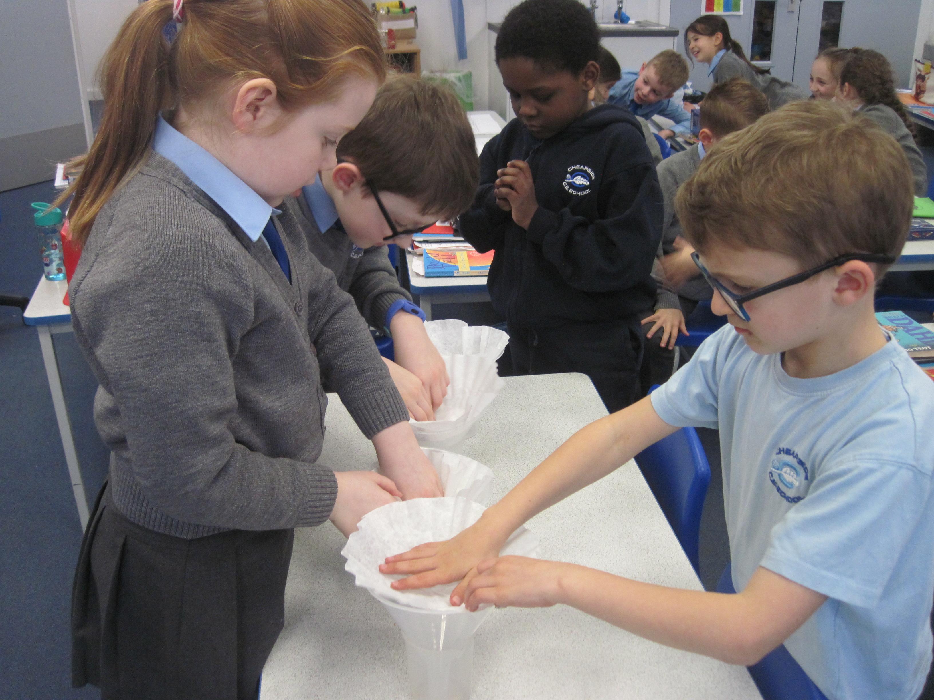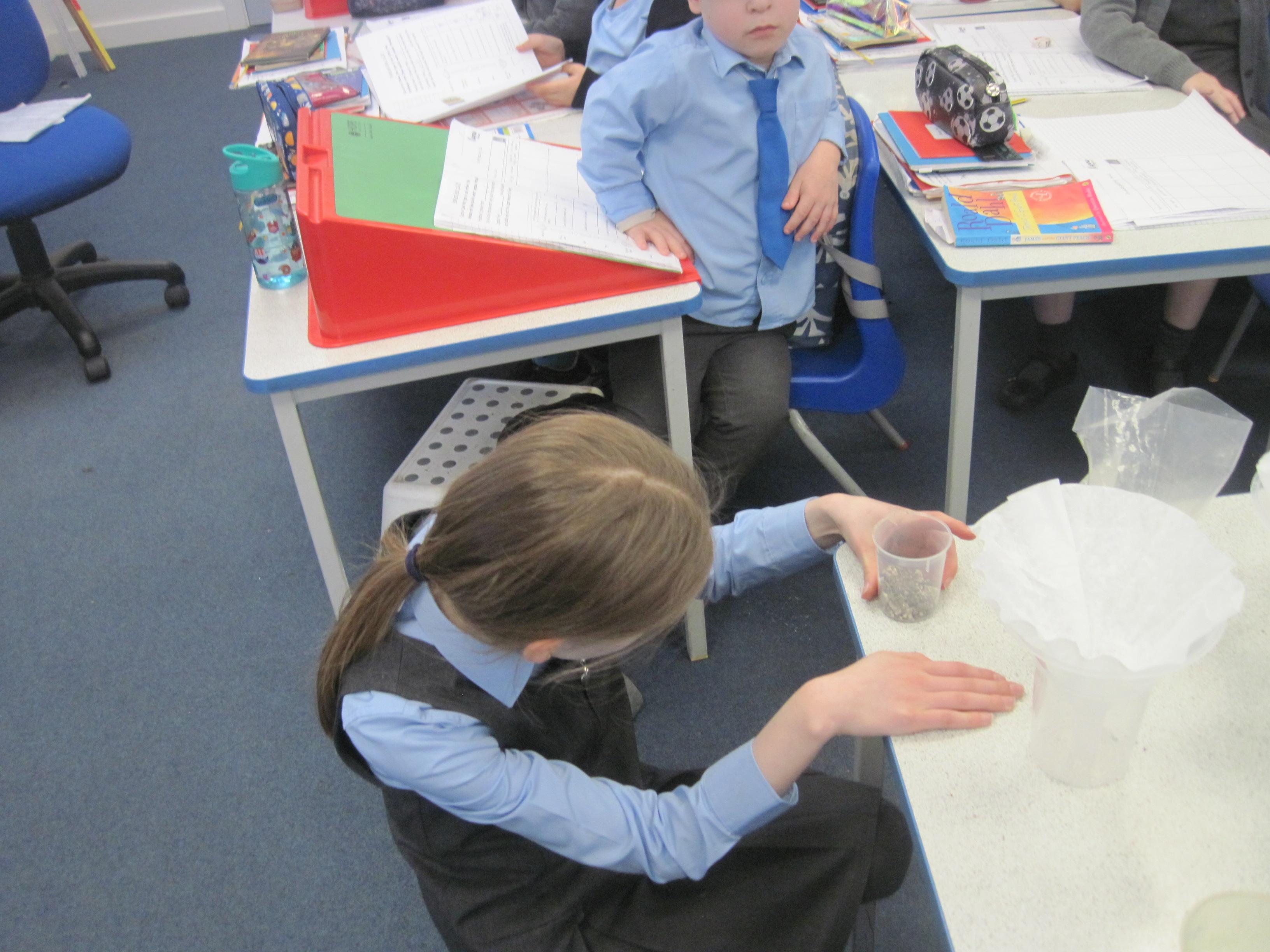 Firstly, the children made a prediction as to the drainage rate of the types of soil. Once again, the children were reminded how to carry out a 'fair test', changing only one variable each time – the type of soil and keeping all other variables the same.