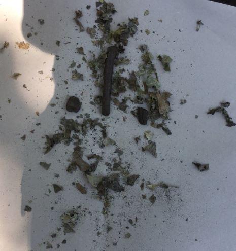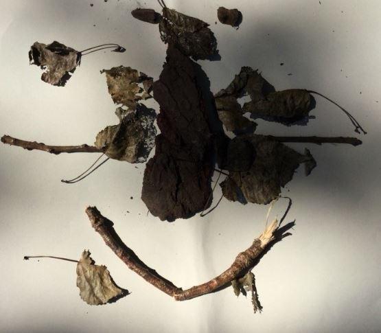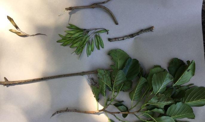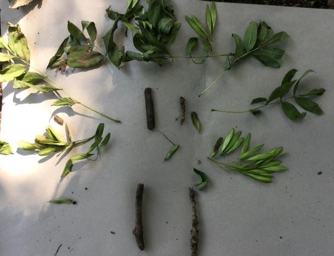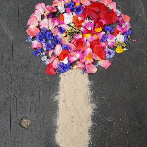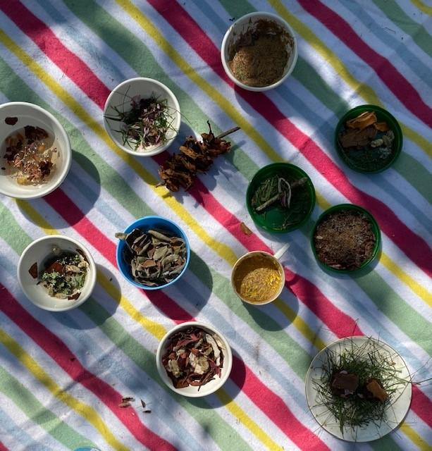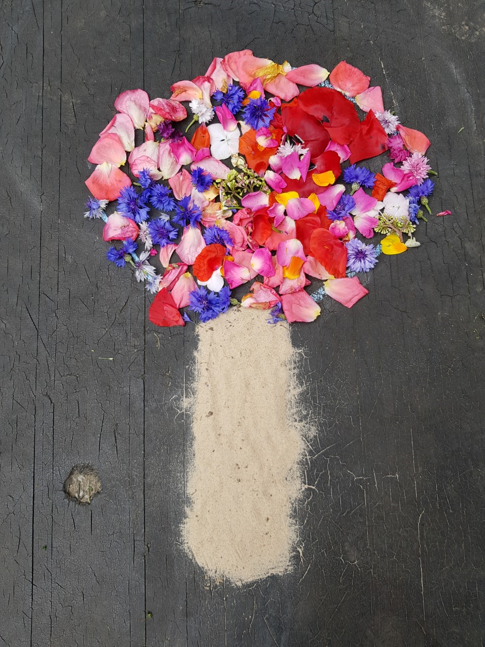 This a forest school picnic out of petals, rhubarb, grass, clover, blossom and catkins.